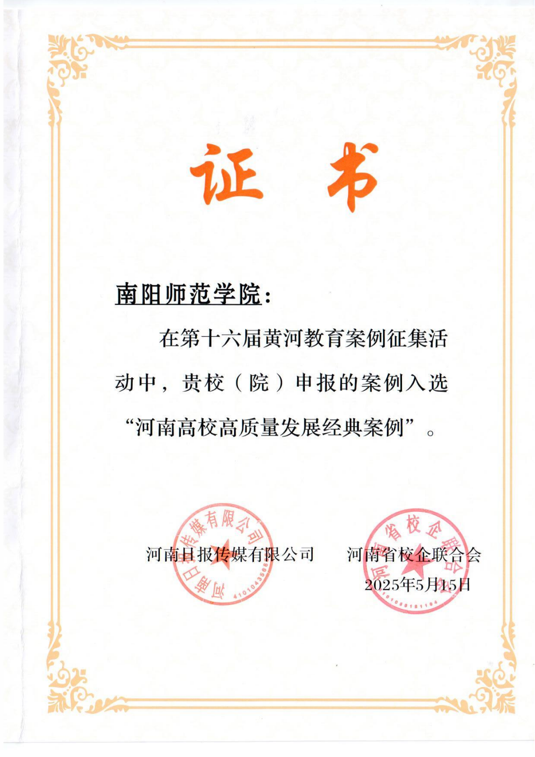 本网讯(通讯员 马骎)5月15日,由河南日报传媒、河南省校企联合会主办,高校毕业生就业协会国际就业实习工作委员会承办的“第十六届黄河教育百校百企合作研讨会”暨协同创新优秀案例发布活动推出评选结果。天游官网党委宣传部组织申报的案例《“以水为魂”服务国家战略,“三色嵌入”创新人才培养模式》,成功入选“高校高质量发展经典案例”名单,展现了学校在推动教育创新与人才培养中的示范作用。