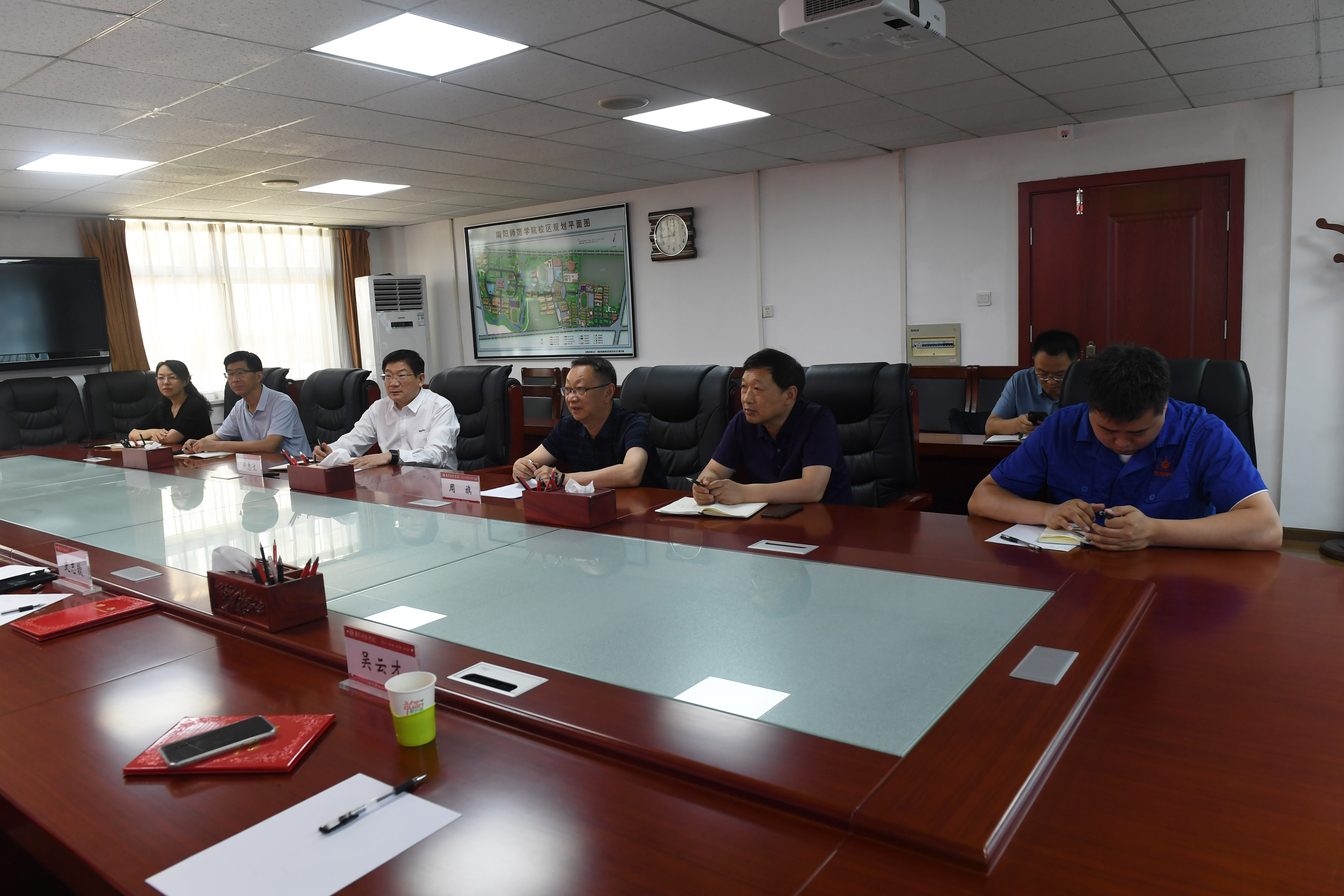 本网讯(李旭/文 李欣然/图)6月20日上午,清华大学“一带一路”战略研究院执行院长史志钦、南阳医专党委书记柳明伟、桂林电子科技大学教授吴云才、南阳金冠电气有限公司董事长兼总经理樊崇等专家一行来天游官网考察交流。天游官网在办公大楼三楼会议室举行交流座谈会。校党委书记卢志文,副校长周旗,教务处、经济与管理学院、南阳发展战略研究院部分专家学者参加座谈会。