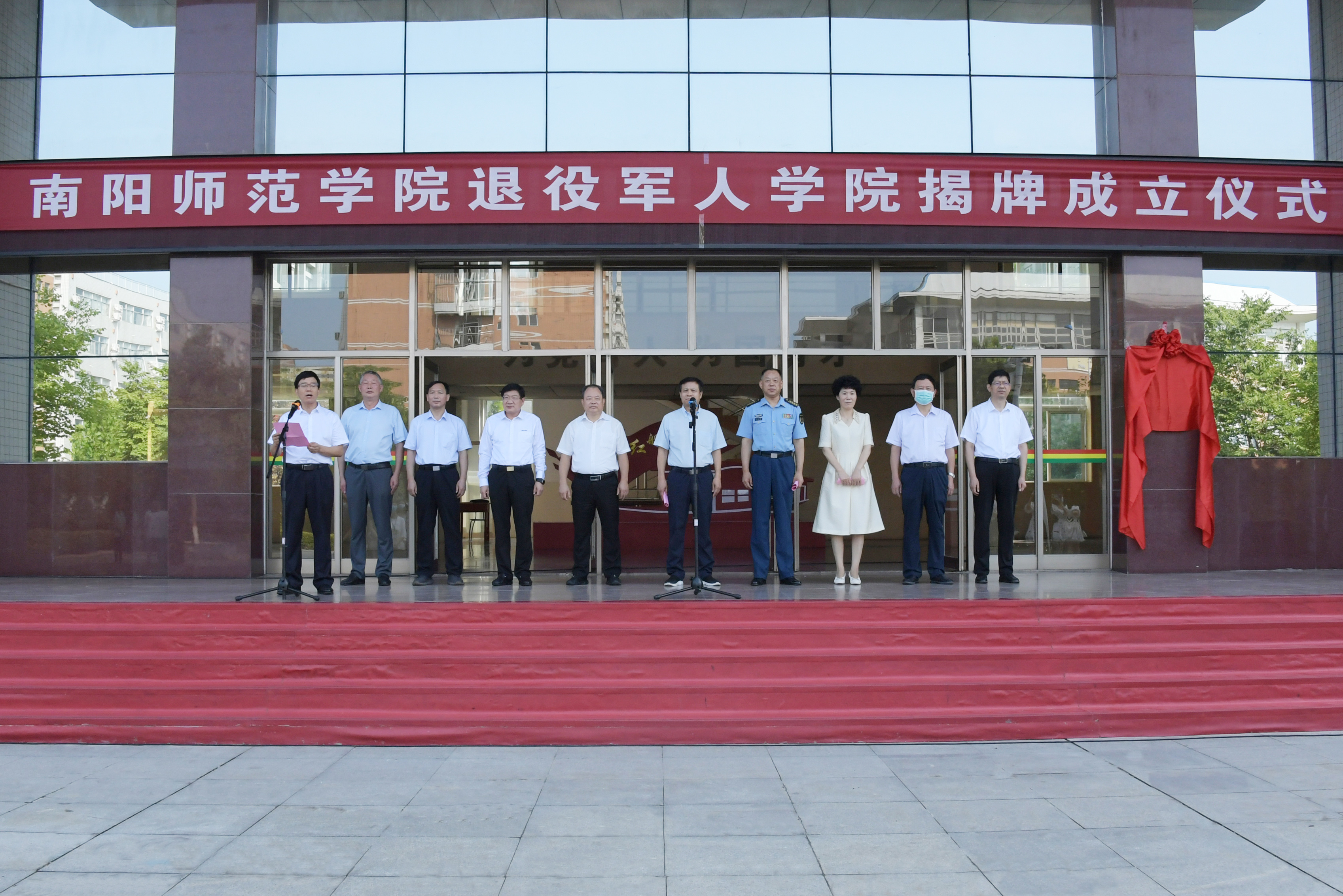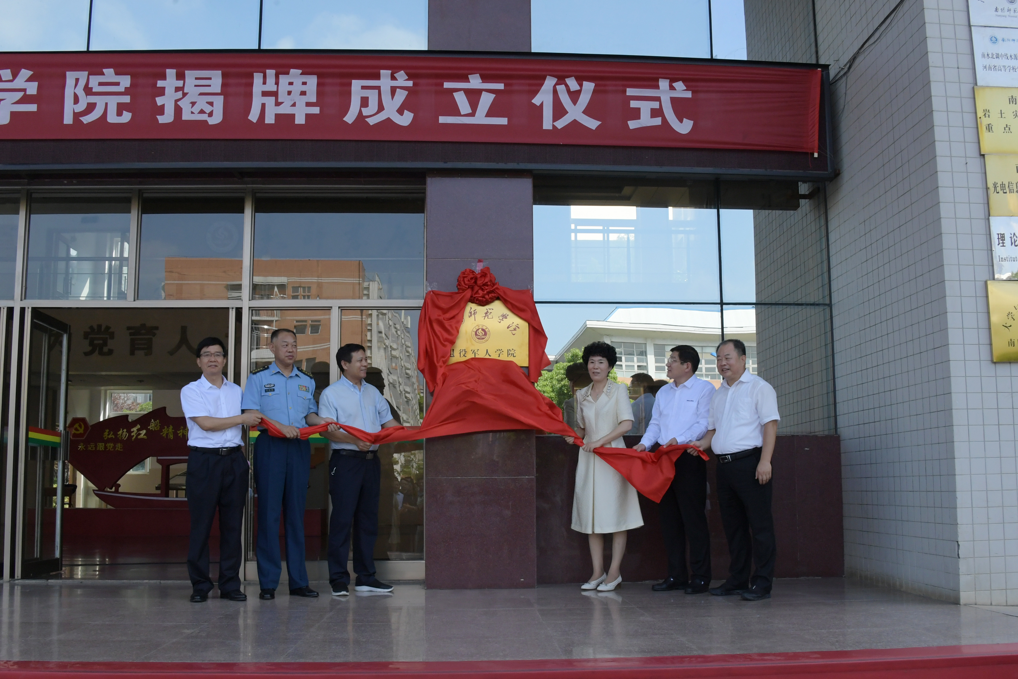 本网讯(刘一夫/文 焦伟平 李欣然/图)7月31日上午,天游官网在科技楼前举行天游ty8线路1线路2检测中心退役军人学院揭牌成立仪式。河南省退役军人事务厅副厅长陈天金,河南省教育厅二级巡视员李培俊,南阳市委常委、市军分区司令员许言龄,南阳市人民政府副市长阿颖,河南省退役军人事务厅军转处处长李德东,省教育厅发展规划处二级调研员刘振海,南阳市退役军人事务局局长吴保生,南阳市教育局局长杨文普,南阳市人力资源和社会保障局副局长罗明柱,校党委书记卢志文、校长张宝锋出席揭牌仪式。张宝锋主持揭牌仪式。学校退役军人代表、相关职能部门和师生代表等参加活动。