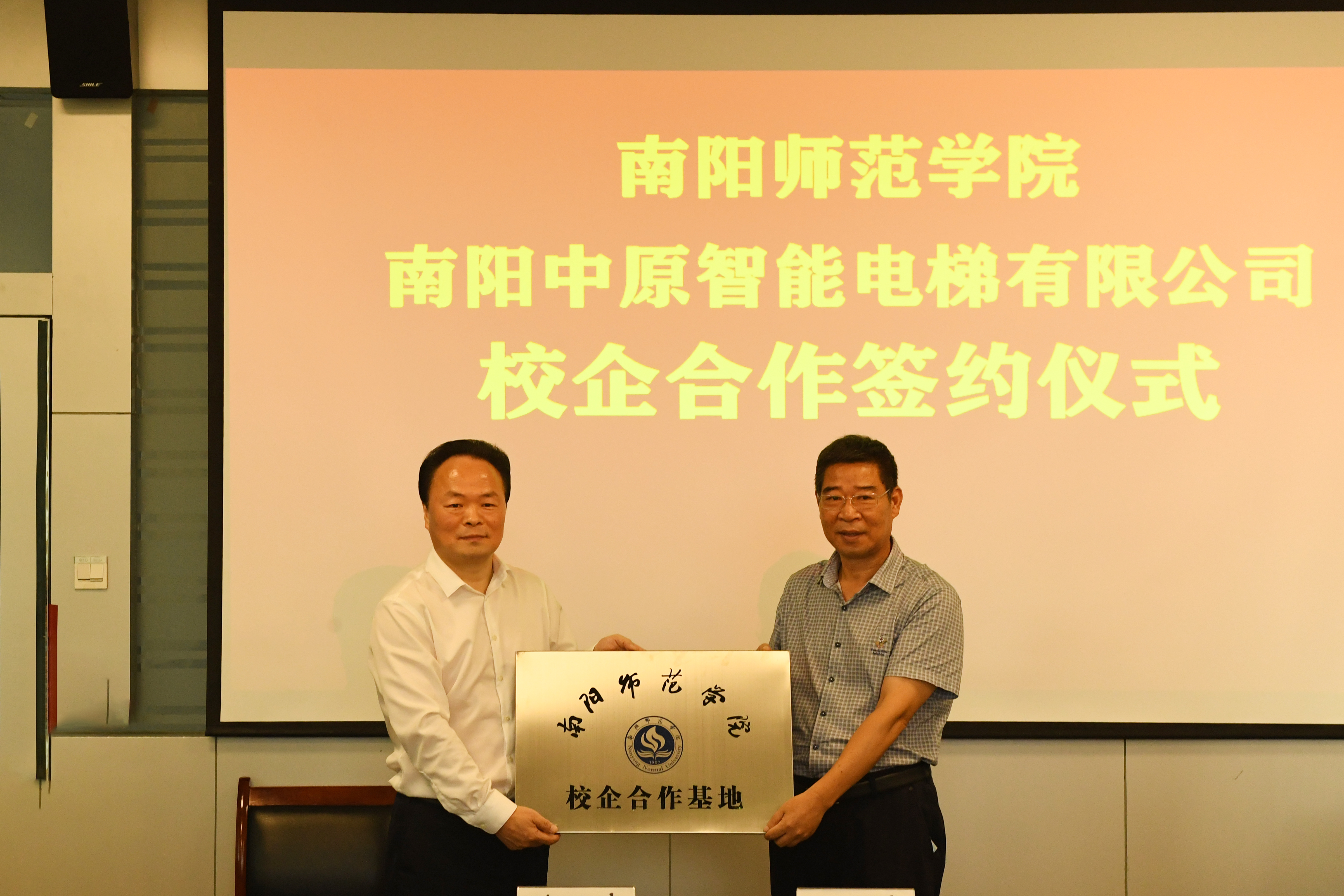 朱其春授予南阳中原智能电梯有限公司“天游ty8线路1线路2检测中心校企合作基地”匾牌。