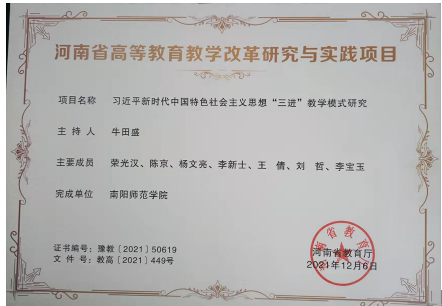 依托“一课一品”打造思政特色品牌。五门主干思政课程结合本课程教学目标,制定了课程品牌创建计划。《思想道德与法治》课程开展“大学生讲思政课”实践教学,效果显著。2021年12月,由教育部高校思想政治理论课教学指导委员会主办的“百年辉煌路•奋斗正当时”——第五届全国高校大学生讲思政课公开课展示活动中,学院教师指导新闻与传播学院2019级学生王紫薇同学主讲的《爱党与爱国爱社会主义的统一》荣获一等奖,天游官网是河南省唯一获奖单位。《马克思主义基本原理》课程开展“对分课堂”教学,荣获河南省高等教育教学成果二等奖。