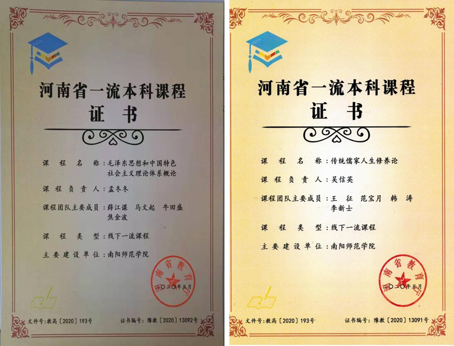 完善思政课课程设置。严格按照国家规定开全课程、开足课时、落实学分。按照省委教育工委、省教育厅统一部署,2022年秋季学期已开设本、专科《习近平新时代中国特色社会主义思想概论》课程。开设了《大国水脉南水北调》《传统儒家人生修养论》《冯友兰人生哲学》等选修课程。现有1门省级精品资源共享课程,1门河南省精品在线开放课程,4门河南省一流课程,4门省级思想政治理论课优秀课程。2个教研室被评为河南省优秀教学基层组织。