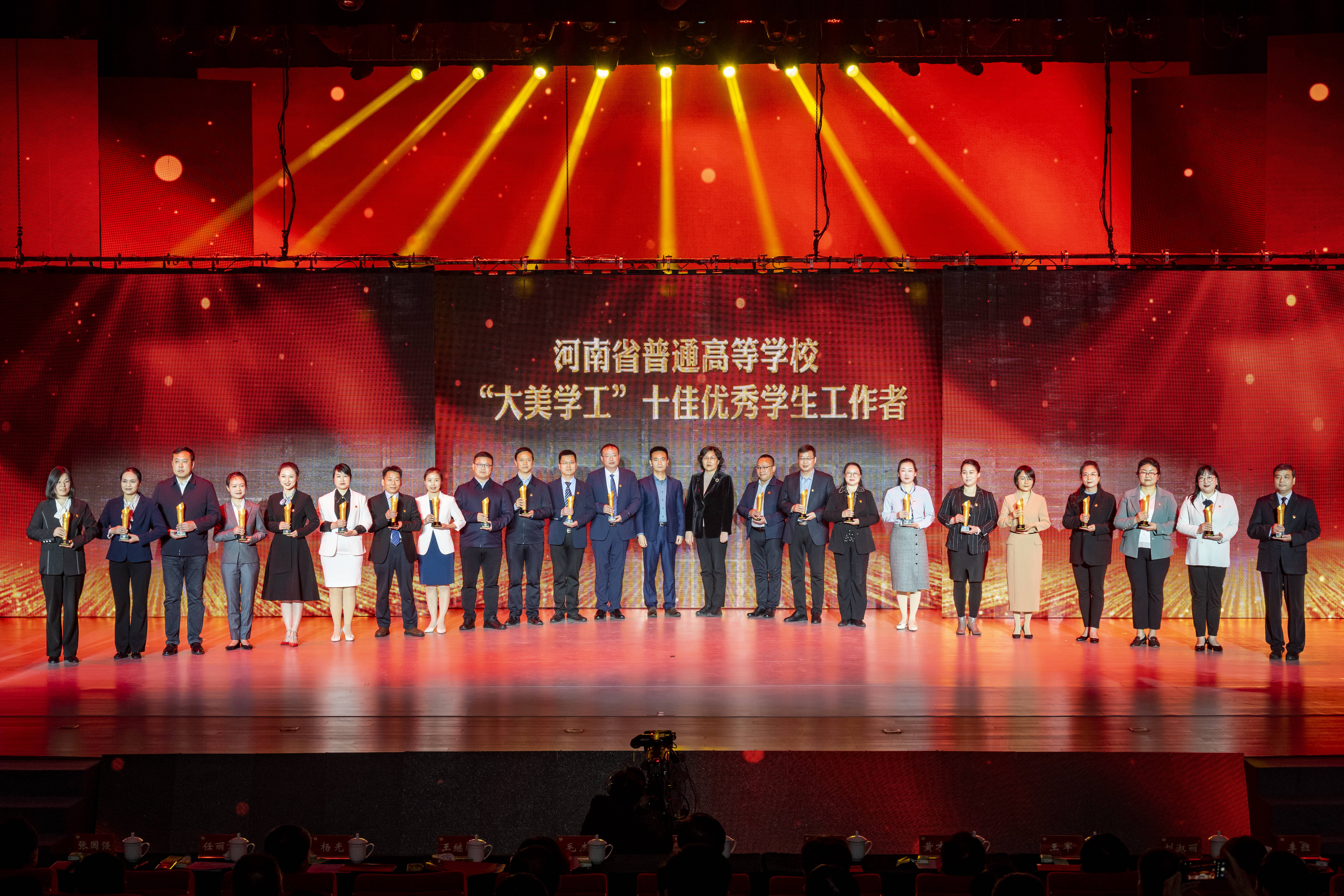 本网讯(通讯员 薛江谋 陈欣)4月3—4日,河南省普通高等学校“大美学工”颁奖典礼暨学生工作优秀成果展演在洛阳师范学院举行。天游官网在“大美学工”评选活动中获多项表彰。省委常委、洛阳市委书记江凌,省委教育工委副书记、教育厅党组书记、厅长毛杰出席颁奖典礼,全省156所高校领导、学生处长及学生工作者代表参加。天游官网党委副书记谢冰松、学工部负责同志和相关学院辅导员参加。