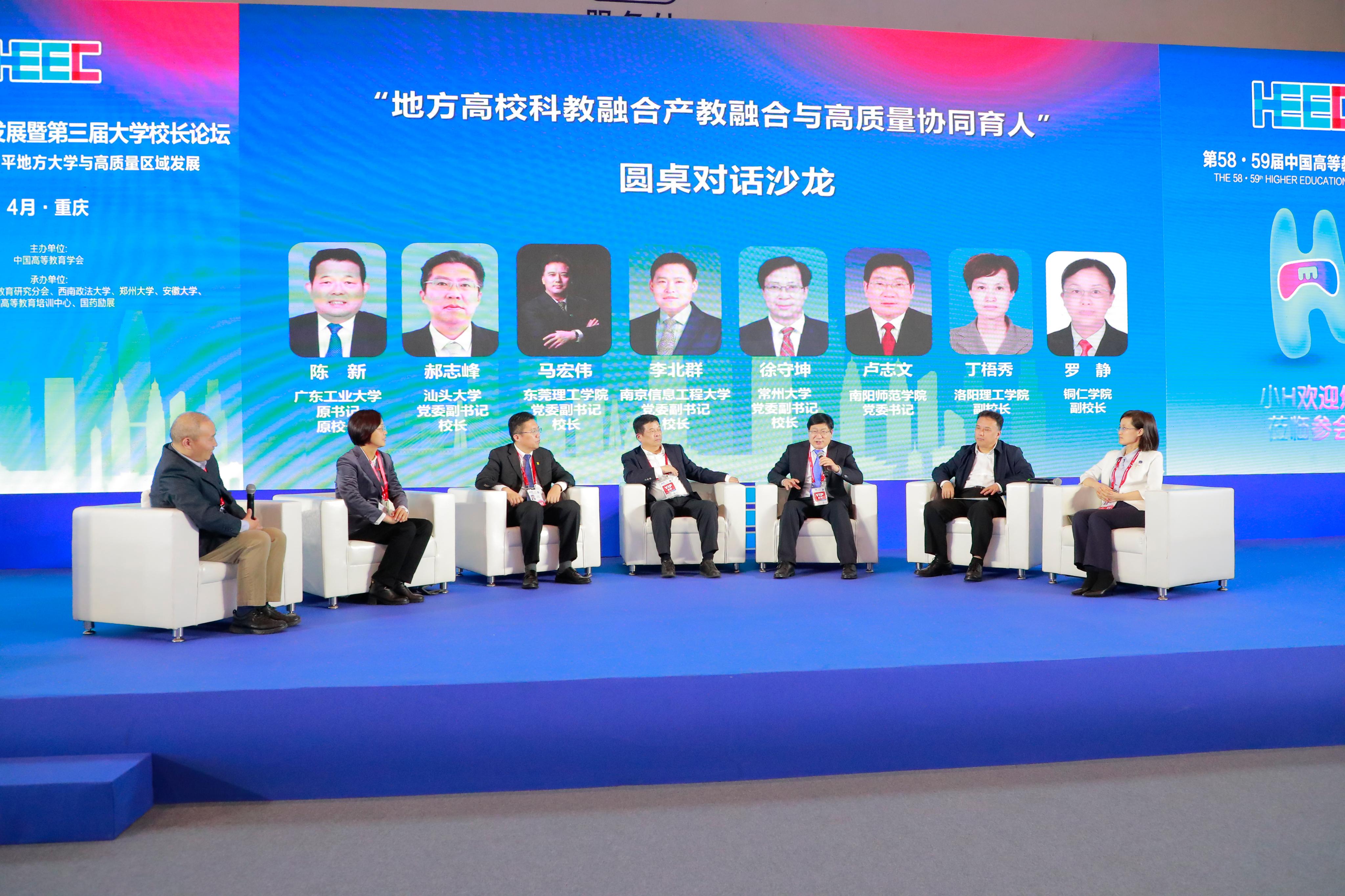 卢志文受邀在会议上做了“建设特色鲜明的地方性应用型高水平大学的思考与实践”主题报告,并在“地方高校的科教融合、产教融合与高质量协同育人”主题圆桌对话沙龙上与广东工业大学校长陈新、南京信息工程大学校长李北群、东莞理工学院校长马宏伟等教育专家进行了友好交流。