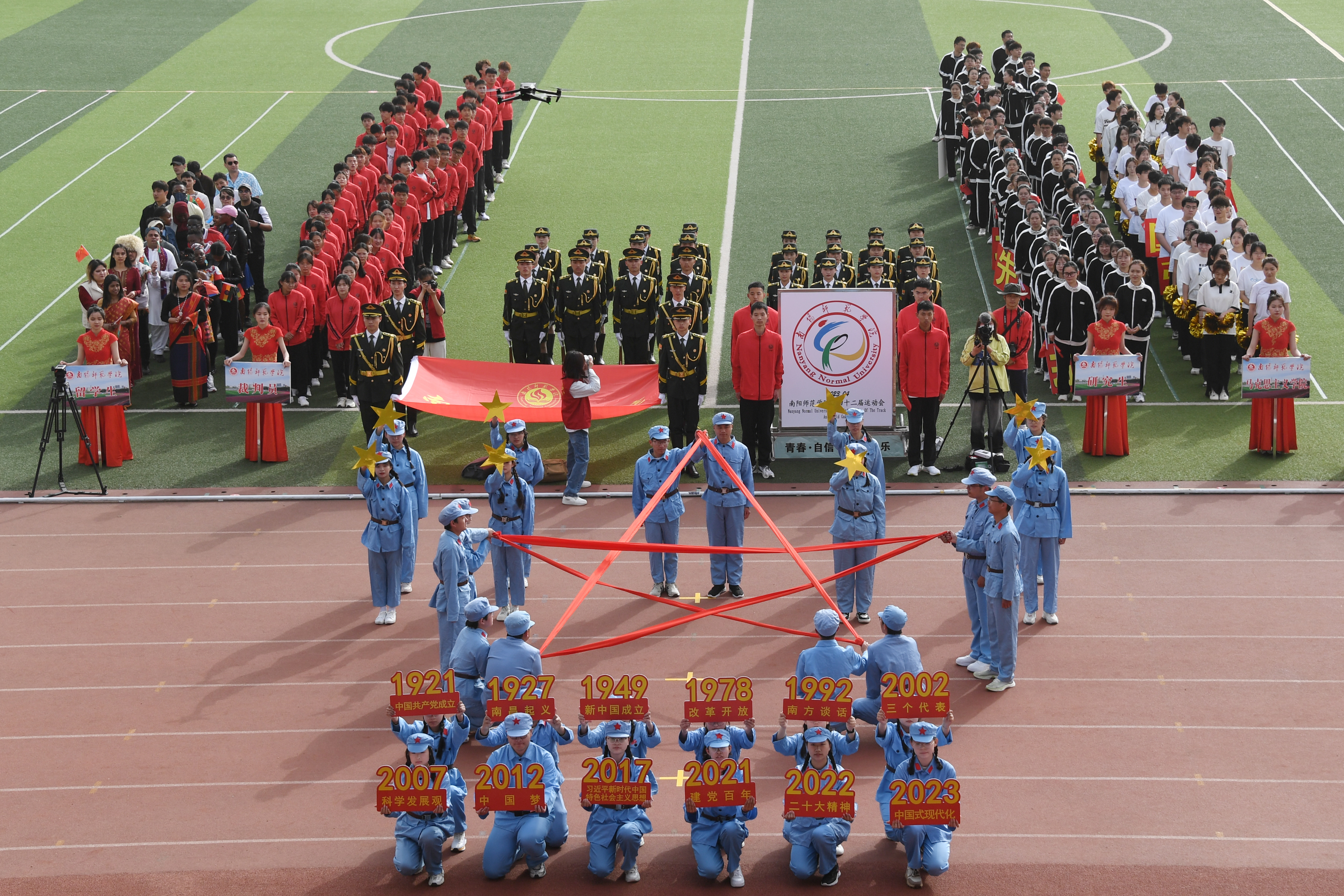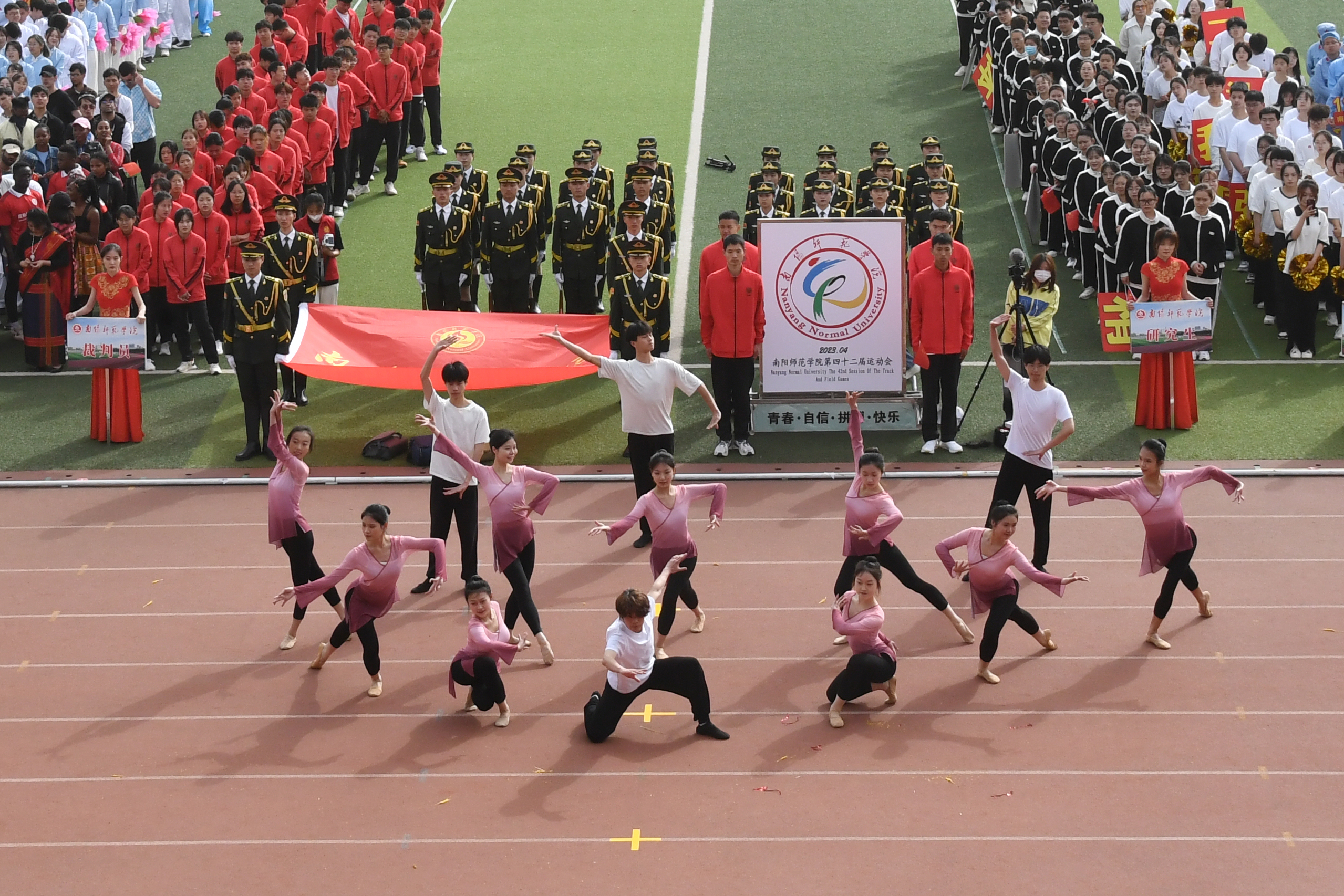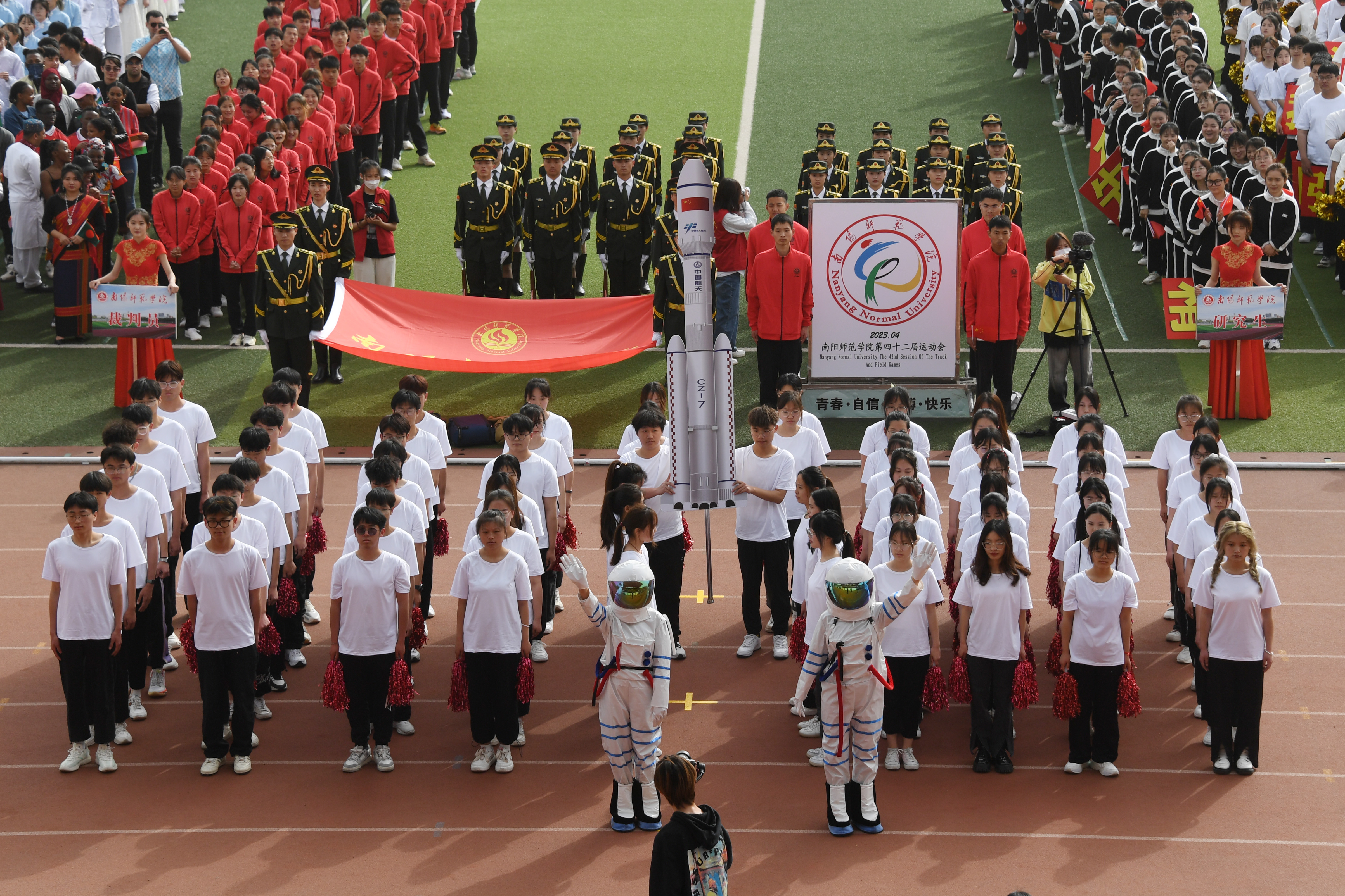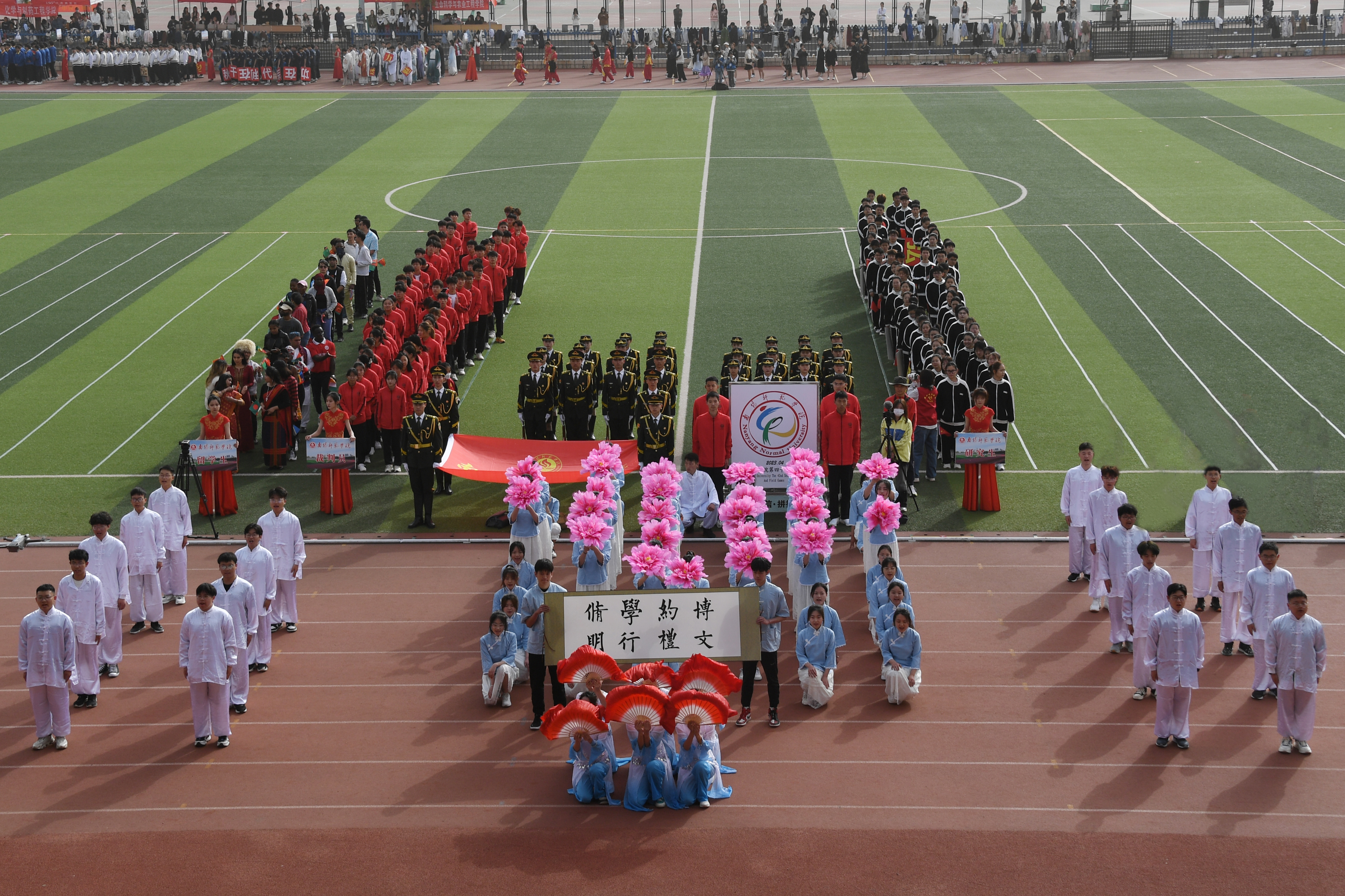 校旗在国防教育协会学生社团的护送下入场,运动会会徽紧随其后。裁判员代表队、研究生代表队、留学生代表队、各学院运动员代表队依次入场,他们热情高涨,神采奕奕,结合自身学科特色给观众们带来了精彩的方阵展演。历史学院代表队统一身着红军服装,利用道具展现中国共产党自成立以来的伟大历史成就。生命科学与农业工程学院代表队意气风发,整齐划一,像手中高举的向日葵和麦穗一样昂扬向上、朝气蓬勃。美术与艺术设计学院用舞姿带来一幅动态的山水水墨画,展现了极具中国元素的文化之美。教育科学学院依托教育专业内容,以舞蹈表演展现出未来高素质教师的精神风貌。土木建筑工程学院代表队举起学校各类建筑模型和测量工具,大方展现专业特色。珠宝玉雕学院方队身着汉服,尽展古韵之美。体育学院武术和拉丁舞的结合体现出刚柔并济之美,展示出扎实的专业功底,诠释着体育人的自信与激情。