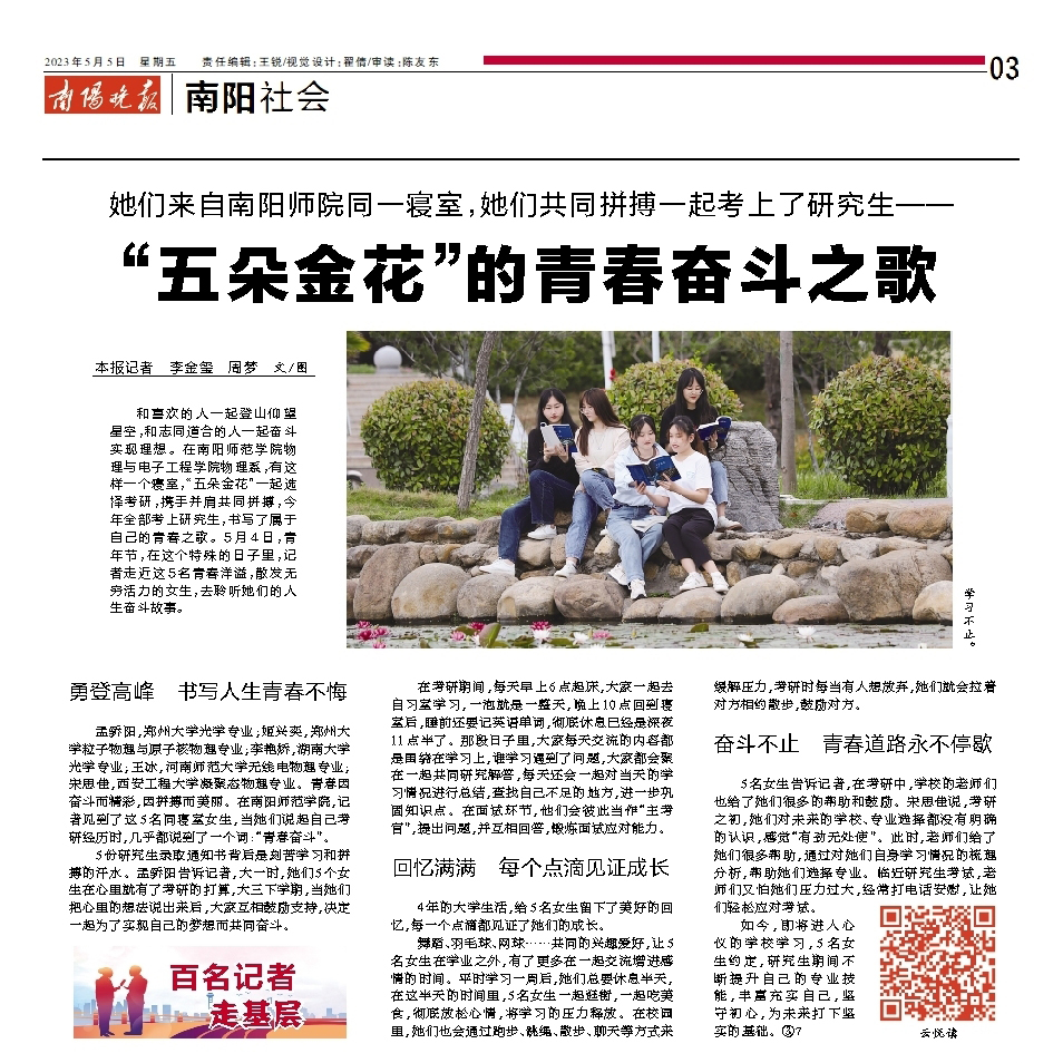 链接:她们来自南阳师院同一寝室,她们共同拼搏一起考上了研究生—— “五朵金花”的青春奋斗之歌 - 南阳晚报多媒体数字报刊平台,南阳晚报 (01ny.cn)