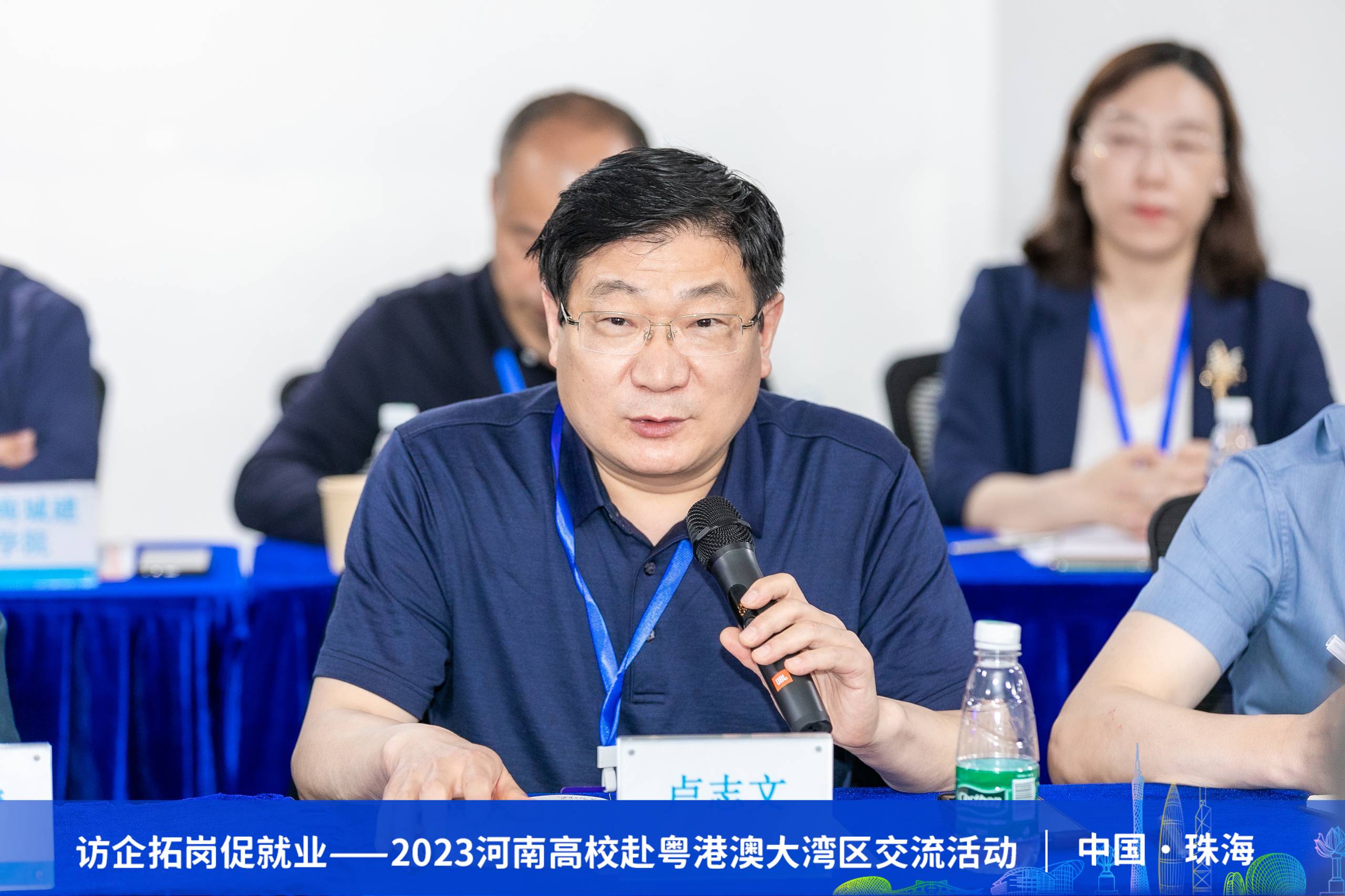 卢志文在校企座谈交流会上讲话。他介绍了开展访企拓岗活动的背景、目的和重要意义,并从教育教学、专业设置、人才培养、校地合作、硕士点建设等方面介绍了学校的基本情况。他指出,学校希望通过此次走访,为毕业生就业拓展就业渠道,了解社会需求,征求企业和毕业生反馈的意见建议,优化学科专业结构,联合企业进行科技攻关和科技成果转化,推进产教融合,实现校企合作共赢。卢志文指出,珠海作为粤港澳大湾区重要发展城市,其先进制造业、装备制造业等产业发展迅猛,新一代信息技术、新能源、集成电路、生物医药等行业协同发展,本地企业配套人才需求量大,而河南省作为人才输出大省,河南高校毕业生学历层次丰富,专业覆盖广泛,人才供给与珠海核心产业发展相契合,希望珠海企业与河南高校加强合作交流,为河南毕业生提供更多就业机会和就业岗位,促进毕业生更高质量更加充分就业创业。