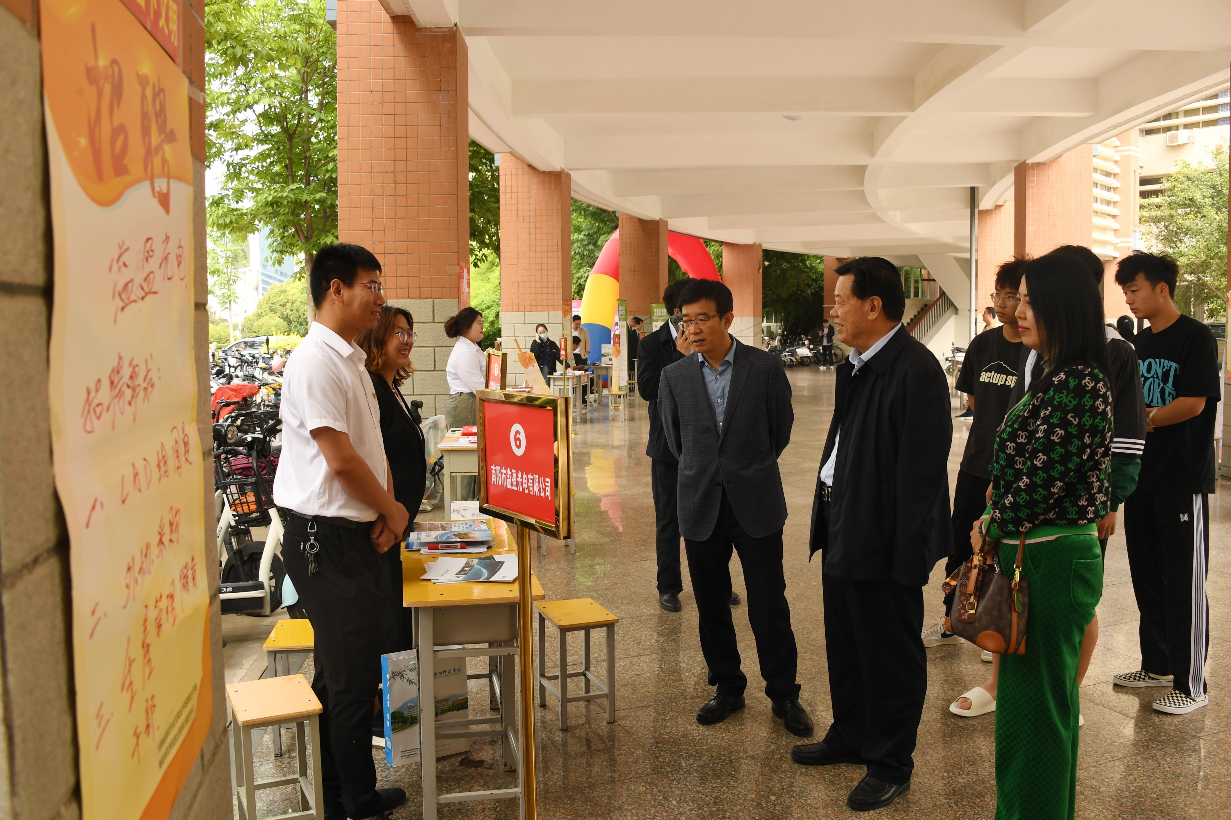 在艺术楼一楼连廊同步举行供需双选活动。牧原食品股份有限公司、南阳宛友信息技术有限公司等10家企业提供就业岗位200余个。张宝锋、谢冰松与参会单位代表恳切交谈,详细了解企业招聘需求、薪资待遇等情况,并推介2023届毕业生。(编审 时树菁)