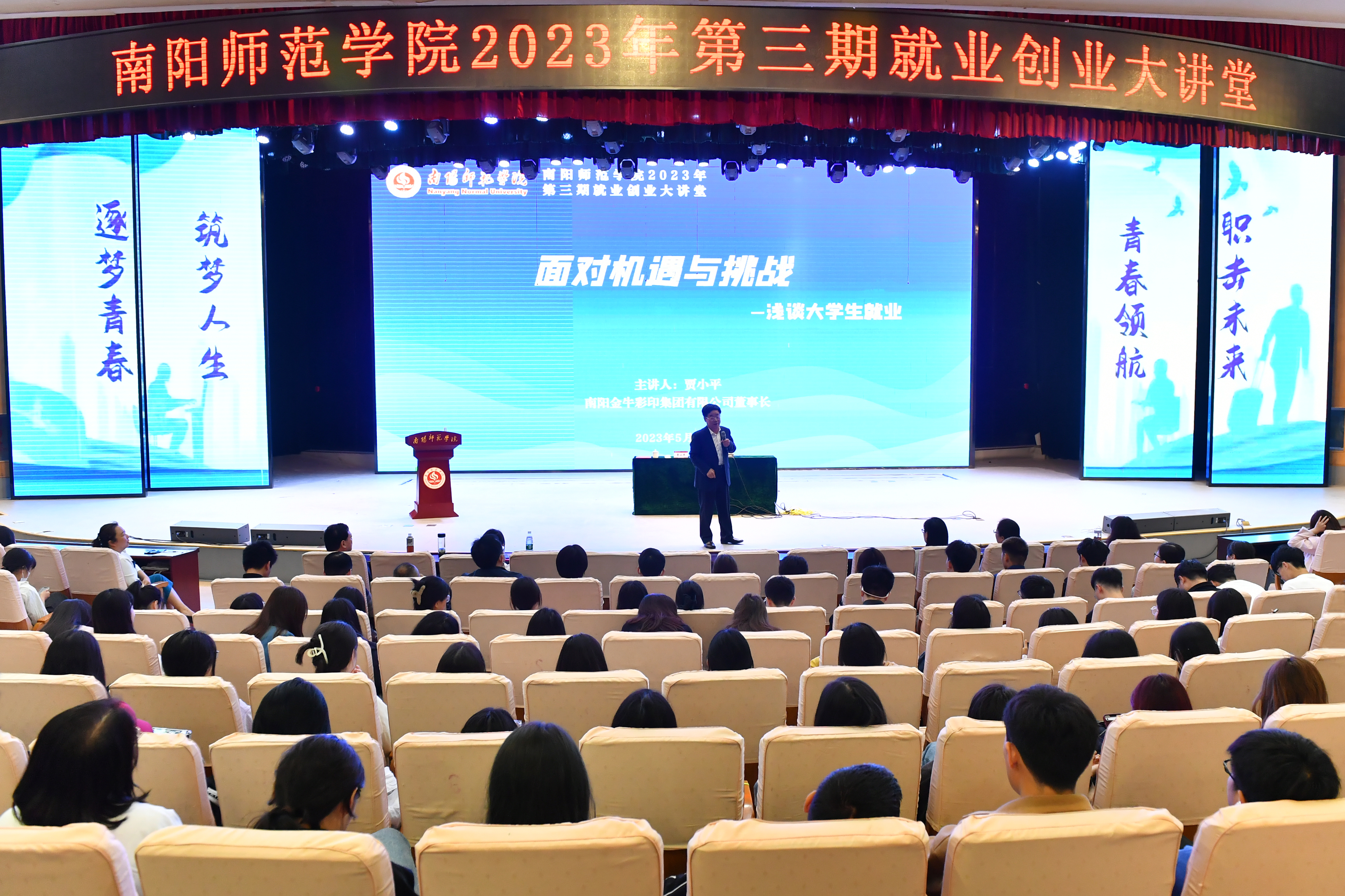 本网讯(程文亮/文 徐佳良/图)5月28日下午,天游官网2023年第三期就业创业大讲堂活动在音乐厅举行。活动邀请南阳金牛彩印集团有限公司董事长贾小平、镇平县电商协会会长满多作报告。校党委副书记谢冰松出席,各学院党委副书记、就业专干和近500名学生代表参加。大讲堂由就业指导与服务中心主任杨洋主持。