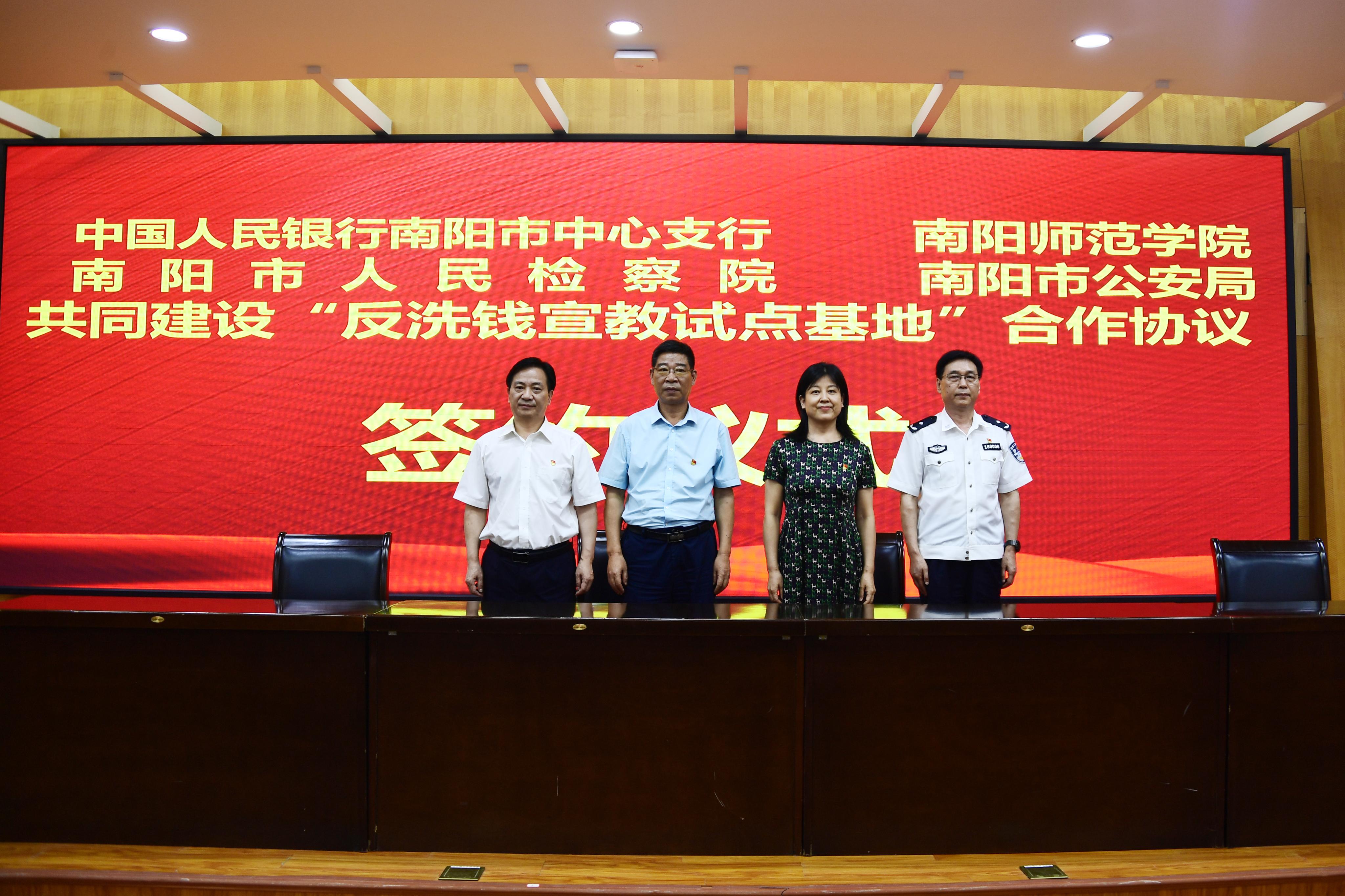 5副校长朱其春、人民银行南阳市中心支行工会主任刘旭鹏、南阳市人民检察院副检察长潘玉亭、南阳市公安局副局长张志刚签署“共建河南省反洗钱宣传教育基地(试点)合作协议”