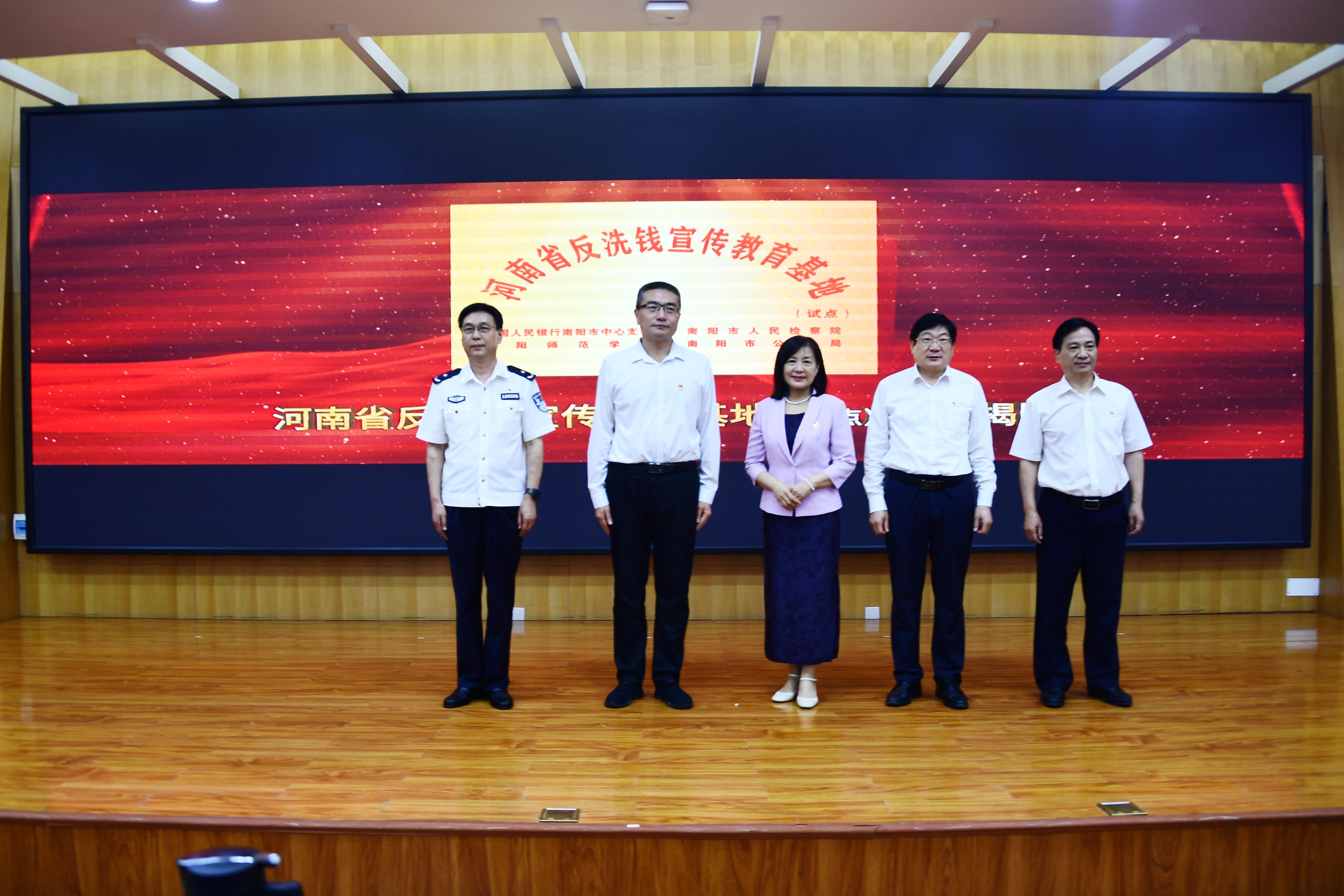 2校党委书记卢志文、人民银行郑州中心支行反洗钱处处长张戈、南阳市人民检察院副检察长潘玉亭、南阳市公安局副局长张志刚共同为“河南省反洗钱宣传教育基地(试点)”揭牌