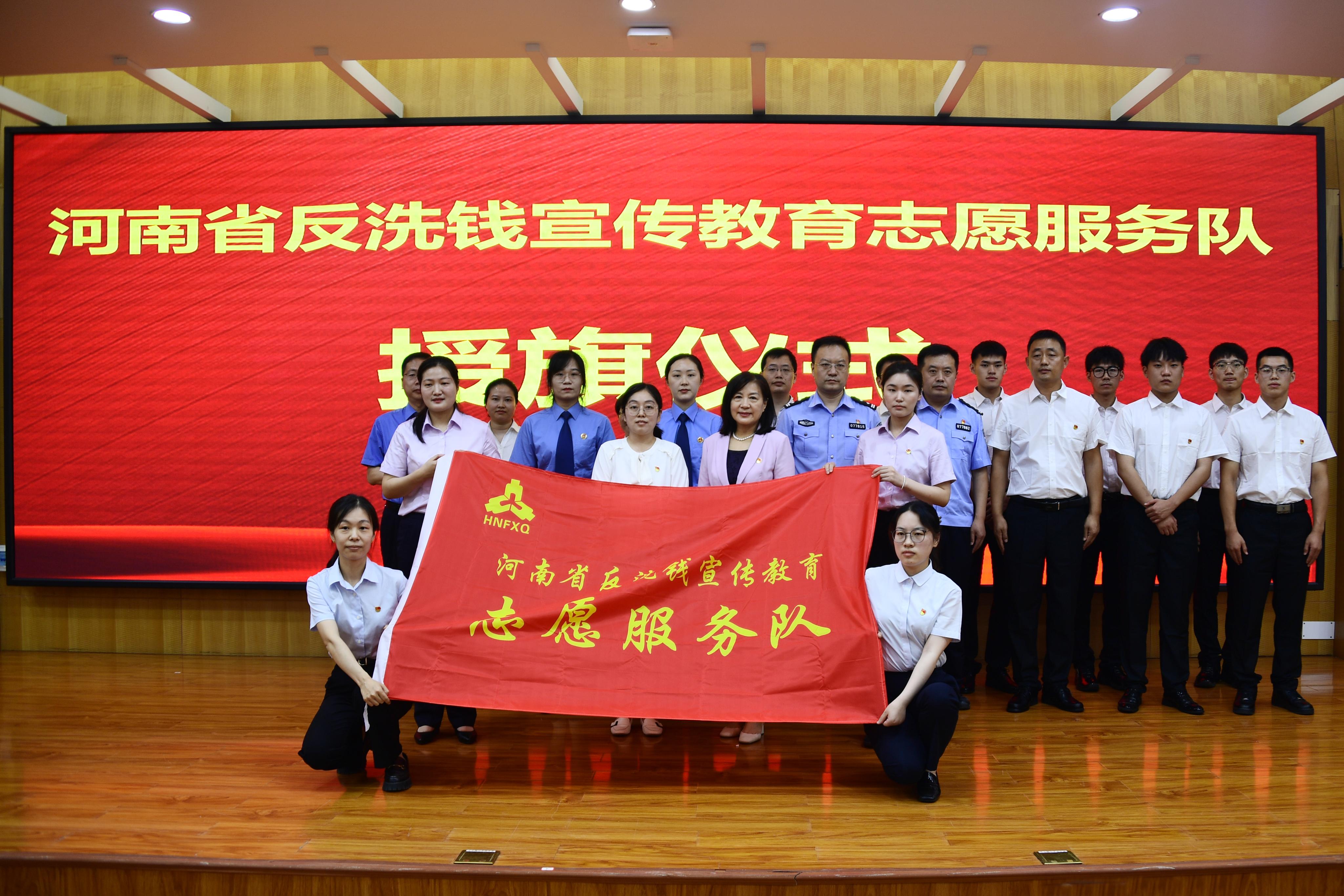 张戈向河南省反洗钱宣传教育志愿者团队授旗。
