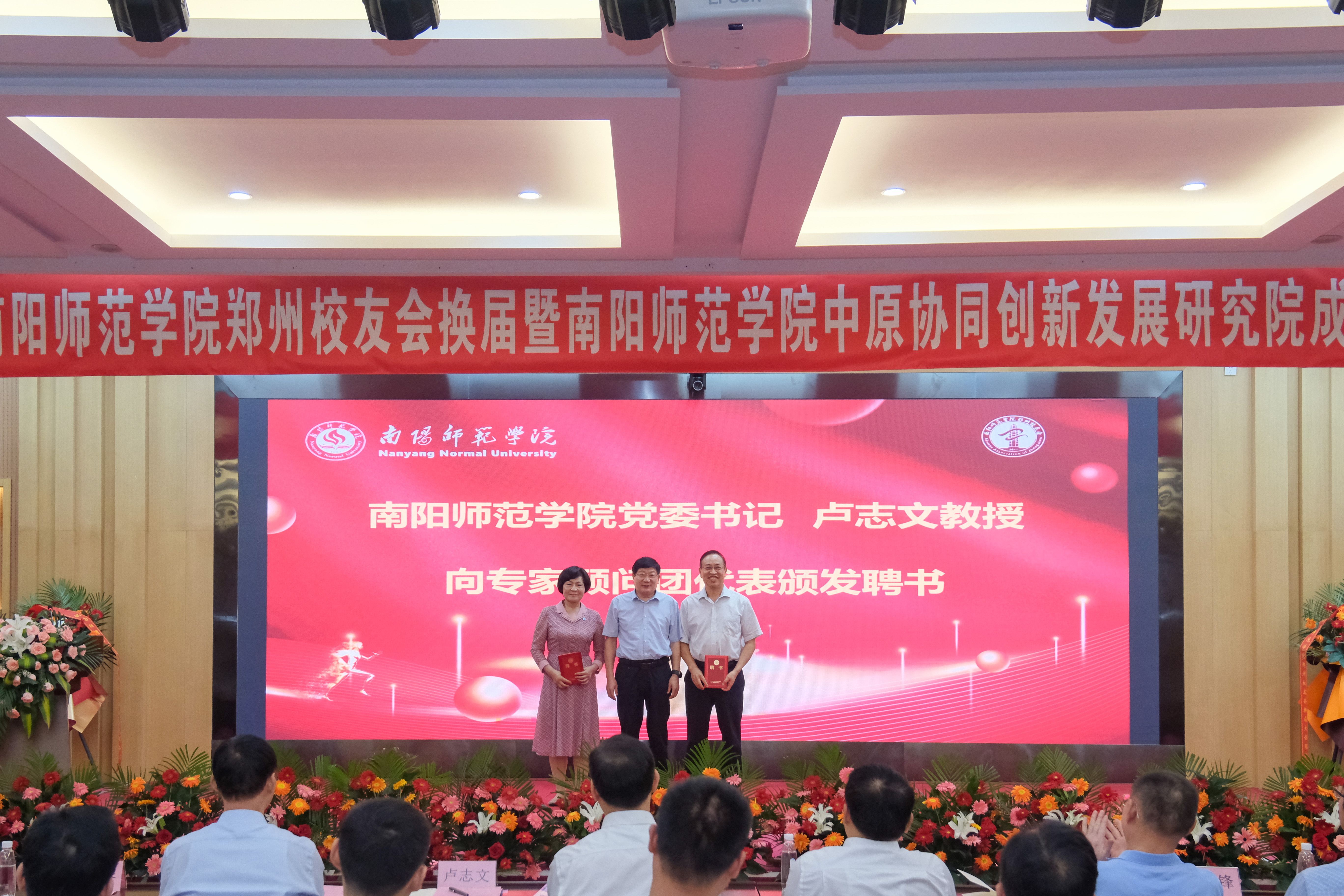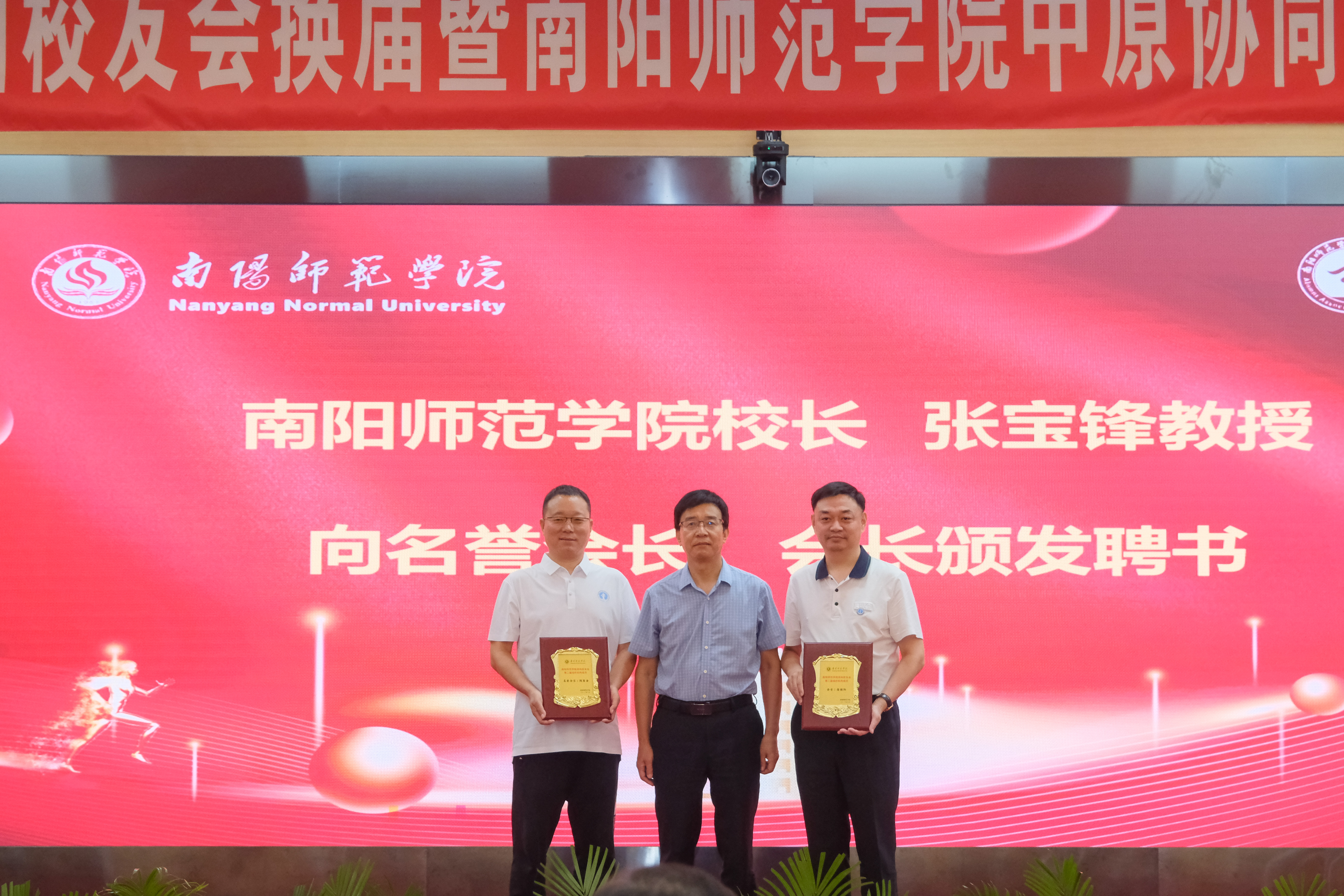 张宝锋、刘红林、熊新忠向郑州校友会第二届组织机构成员颁发聘书。