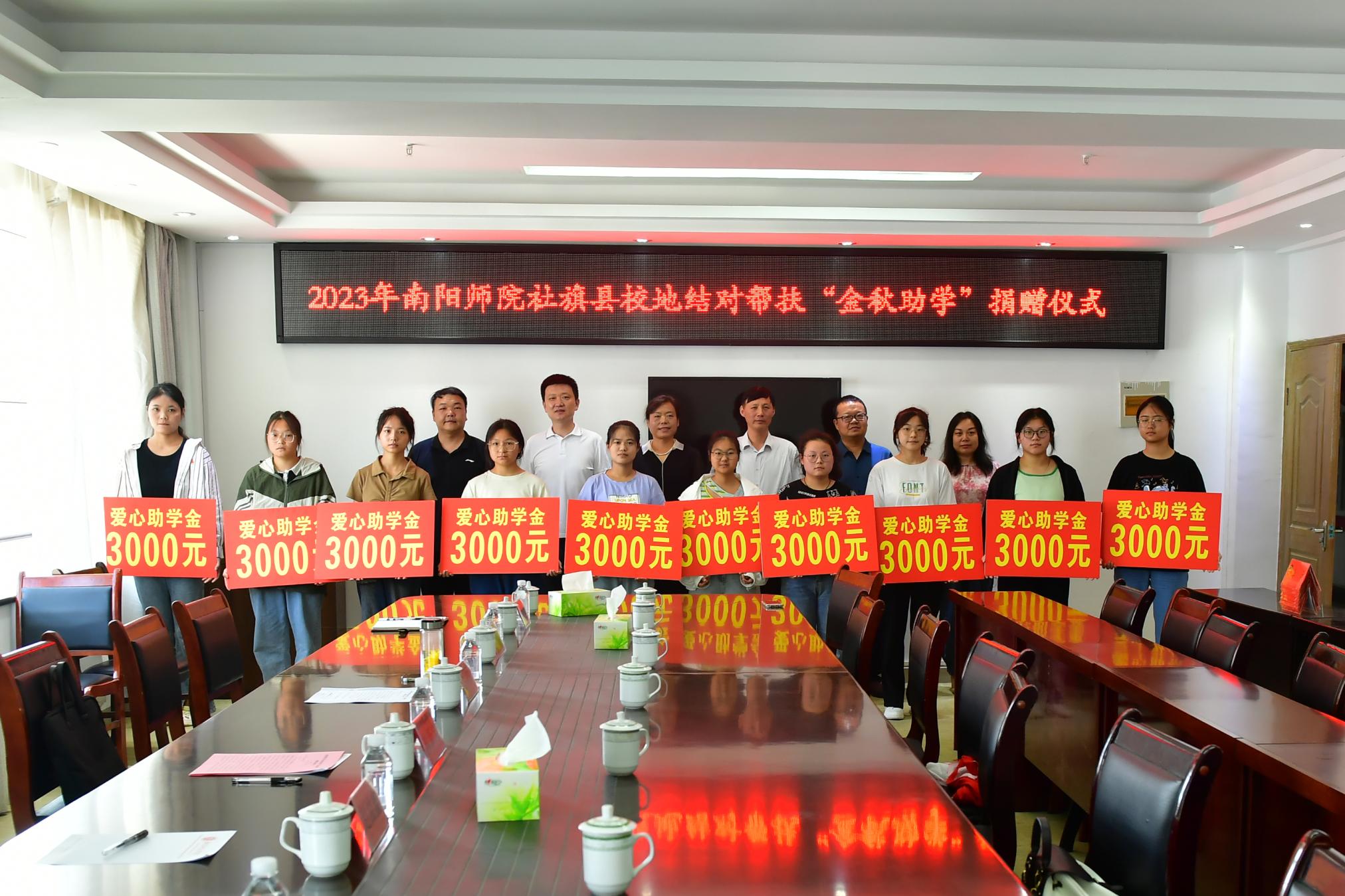 熊新忠代表学校向10名受资助贫困大学生发放助学金,并向他们表示祝贺,对即将开启人生新征程的受助大学生提出几点希望。第一,要胸怀理想,志存高远,依靠勤劳和汗水开辟人生和事业前程。第二,要求真学问,练真本领,学习就必须求真学问,求真理、悟道理、明事理,希望同学们倍加珍惜来之不易的学习机会和稍纵即逝的青春年华,惜时如金、踏实努力。第三,要懂得感恩,回报社会。希望同学们把感恩之心化为实际行动,用满腔的热忱、过硬的本领回报家乡、回报社会,积极工作、艰苦创业,去帮助更多的人。天游ty8线路1线路2检测中心与社旗县的校地结对帮扶工作也将继续走深走实,以更有力的举措、汇聚更强大的力量,为社旗县实现经济社会的高质量发展做出更大的贡献。(编审 张君明)