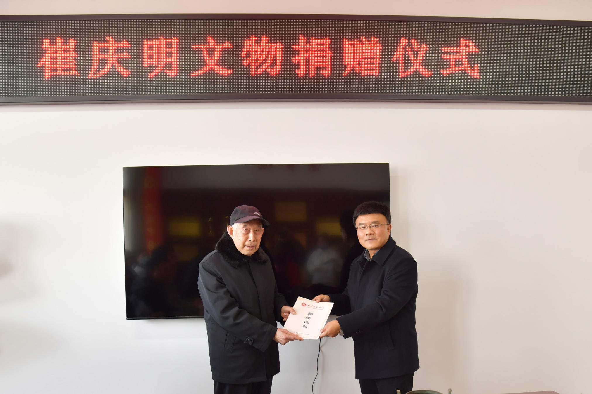 刘红林为崔庆明先生颁发捐赠证书。