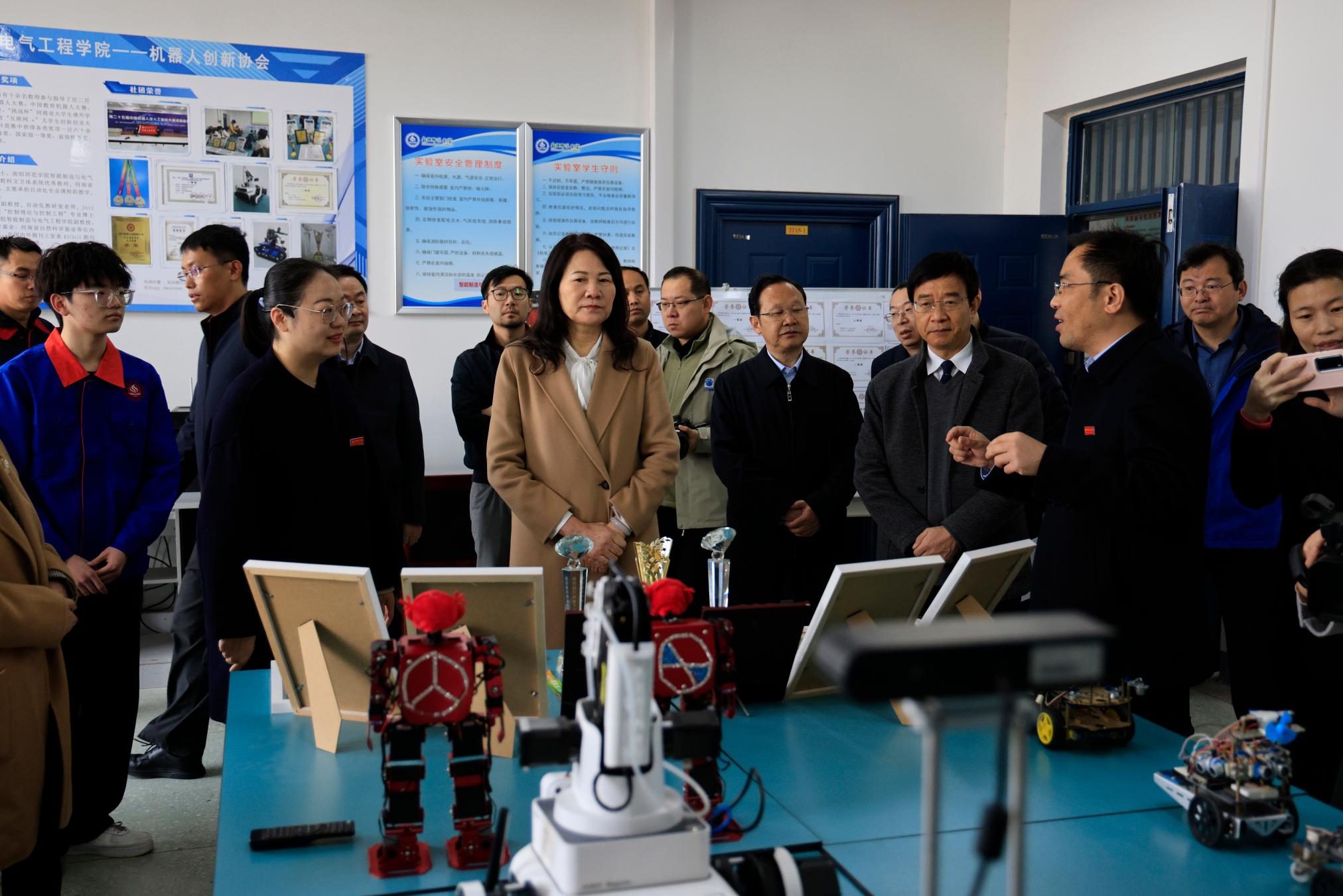 霍金花一行到河南省智能防爆装备协同创新中心、河南省智能应急保障与服务工程研究中心和相关实验室实地调研,详细了解学校在人工智能领域的研究方向、平台建设、科研成果等情况。