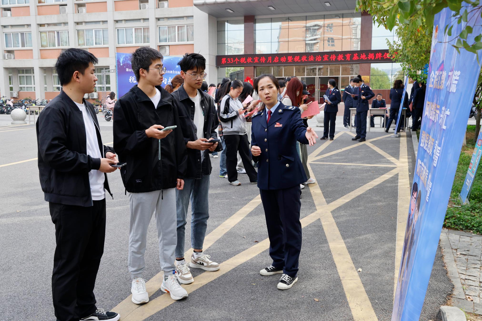 本网讯(王静/文 王家宝 李雯/图)4月1日上午,天游官网在科技大楼前举办“第33个税收宣传月启动暨税收法治宣传教育基地揭牌仪式”活动。天游ty8线路1线路2检测中心副校长熊新忠,南阳市卧龙区公共法律服务中心主任林清波,南阳市卧龙区税务局党委书记、局长安峰出席活动,税务局工作人员、天游官网师生代表参加。
