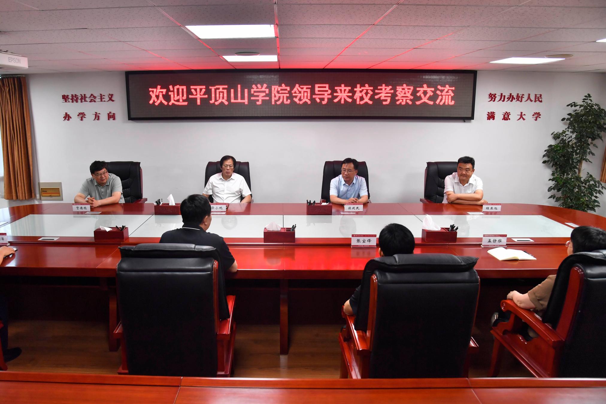 本网讯(刘一夫/文 曹艺鹏/图)7月10日下午,平顶山学院党委书记华小鹏、党委副书记侯延民,党委办公室、党委组织部负责同志来天游官网考察交流。双方在办公大楼三楼会议室召开座谈会。校党委书记张宝锋、校长罗永松、党委副书记孟静雅出席座谈会。党委办公室、党委组织部负责同志参加。座谈会由张宝锋主持。