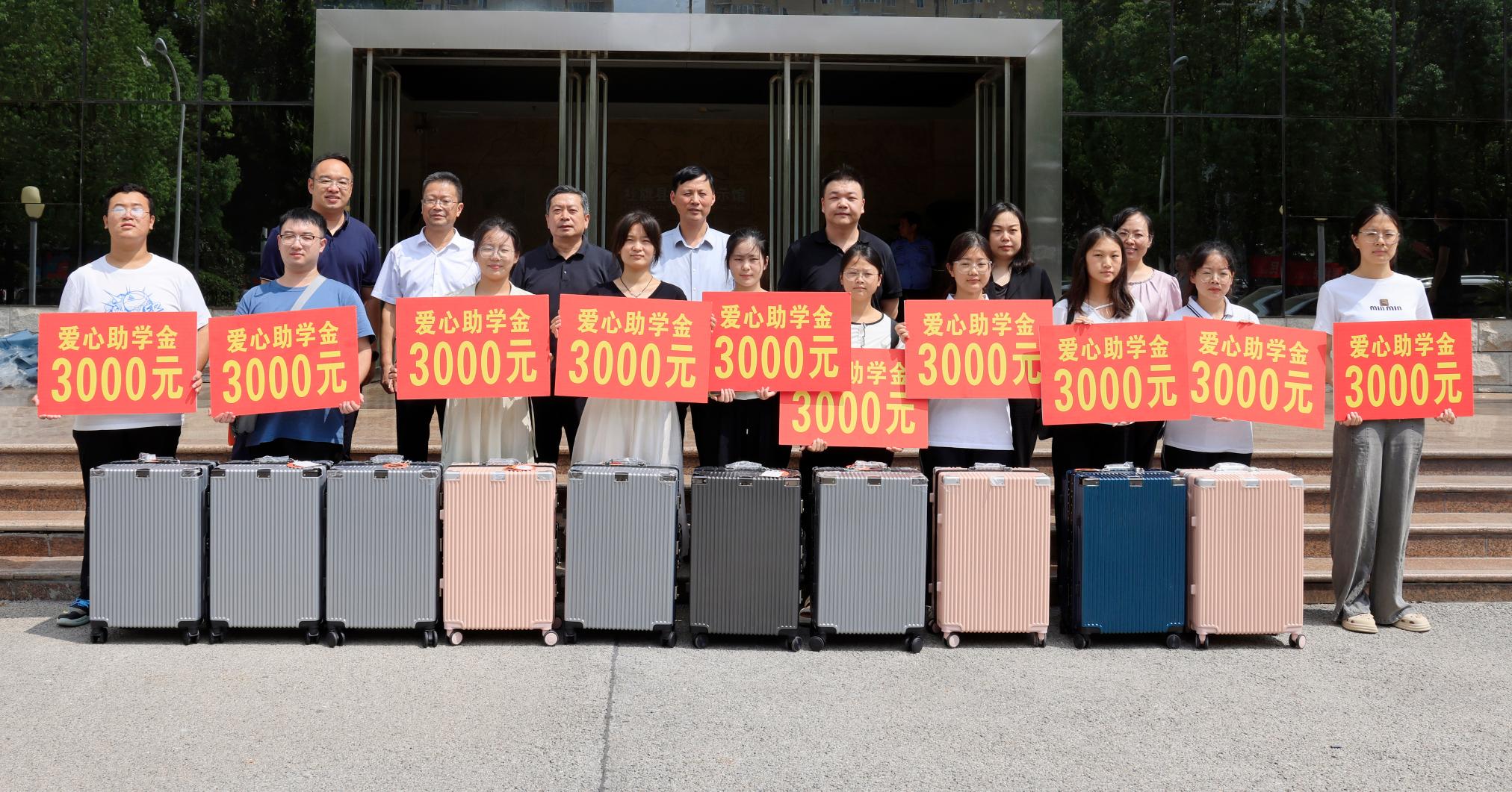 熊新忠代表学校向10名受资助贫困大学生发放助学金及行李箱等物品,并向他们表示祝贺。