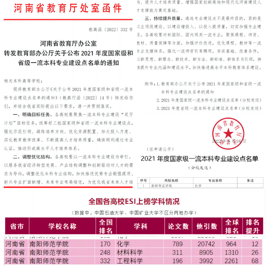 聚焦国家战略性新兴产业重大战略需求,以服务南水北调源头区域水安全和区域经济发展为使命,坚持一体化发展理念,统筹规划学科专业建设。获批国家一流本科专业建设点、河南省一流专业建设点和河南省重点学科—化学;获批化学一级学科、生物与医药专业学位和学科教学(化学)专业学位等3个硕士点。化学专业2019年在河南省实行一本招生、2020年与泰国曼谷皇家理工大学开展合作办学、2021年通过教育部师范类专业二级认证,专业特色更加凸显。共建“河南省生态安全与水资源保护学科群”和“河南省光电信息与智能制造特需急需骨干学科群”,协同申报“南水北调中线水源区流域生态安全高等学校学科创新引智基地”。化学、材料科学和工程科学3个学科先后进入ESI世界排名前1%,国际影响力持续提升。