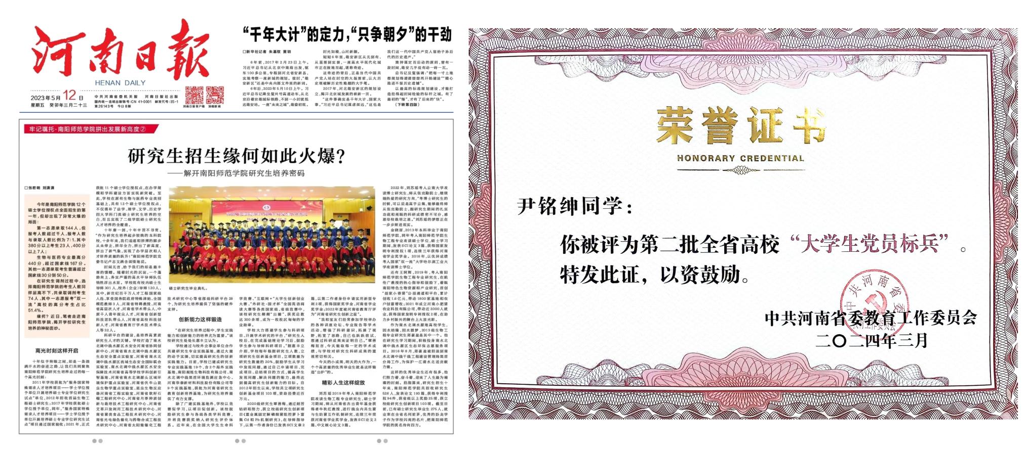 本硕学生获得国家级竞赛奖励110余人次。发表论文450余篇,其中SCI 1区论文30余篇,授权专利50余件,获批省级大学生党员标兵1人,省级“三好学生”3人,省级创新之星4人,省级优秀学位论文10余人。积极参与志愿服务,助力学校“南水北调中线水源区生态环保志愿服务项目”和“科技支农志愿服务项目”先后被评为全国学雷锋志愿服务最佳项目。学校毕业生服务南水北调、服务地方相关事迹获《光明日报》《河南日报》等主流媒体多次报道。