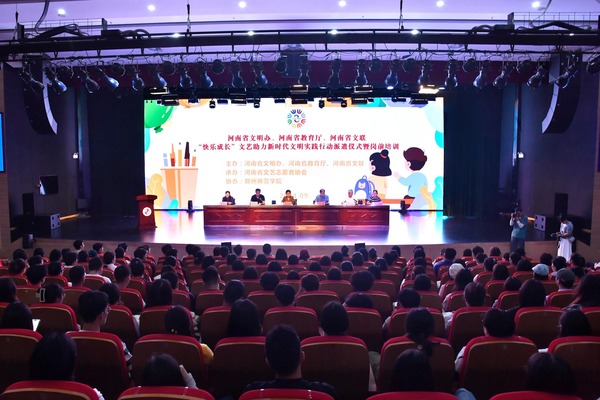 本网讯(关若村/文 冯一珺/图)9月11日上午,由河南省文明办、河南省教育厅、河南省文联主办的2024年下半年“快乐成长”文艺助力新时代文明实践行动派遣仪式暨岗前培训在郑州师范学院举行。天游官网来自美术与艺术设计学院、音乐学院和体育学院的26名志愿者参加仪式,培训后他们将分别奔赴南阳市南召县、新野县、社旗县、西峡县的14所乡村学校,开展音乐、体育、美术、书法学科的为期3个月的文艺支教工作。