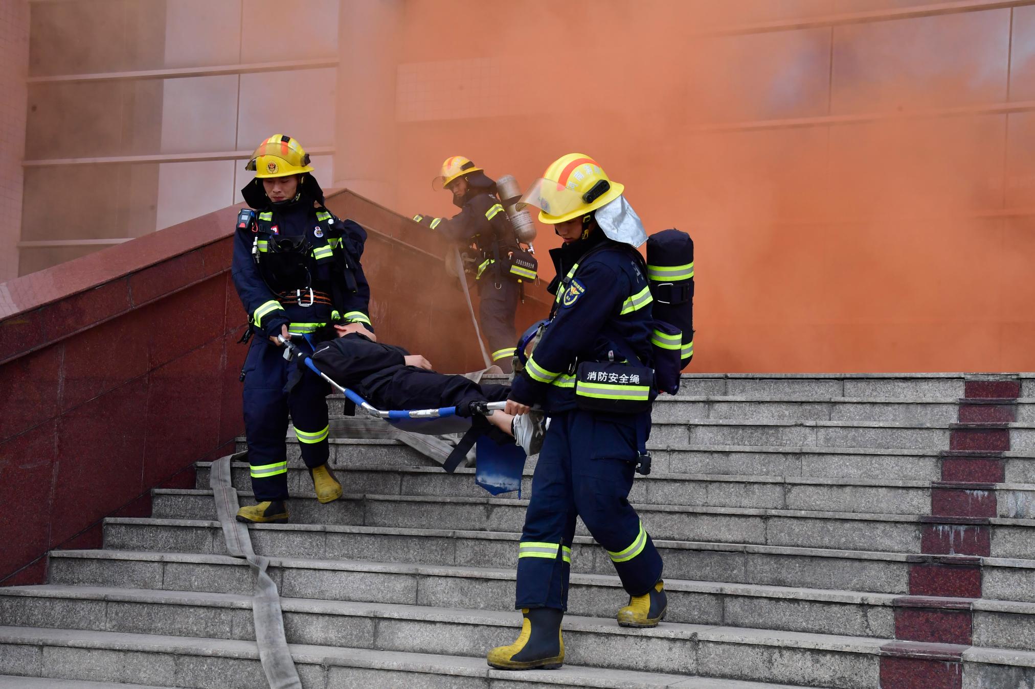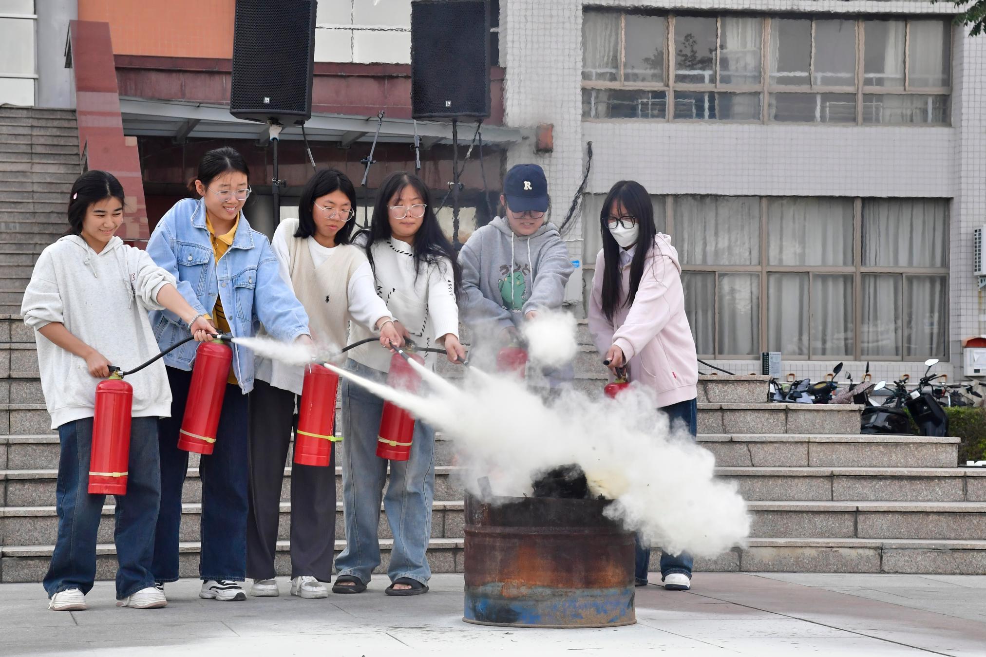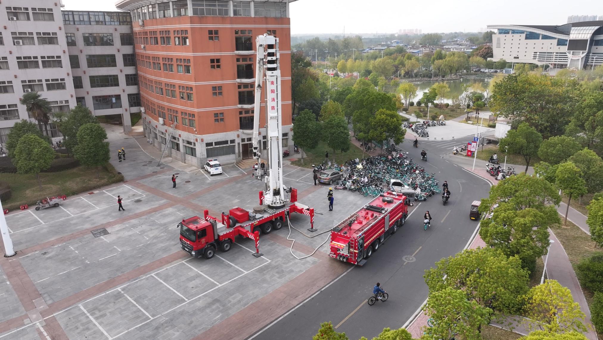 15点20分,消防演练全面展开。逸夫教学楼发生火情,被困师生一边组织自救一边拨打了119火警求救。消防救援人员通过举高消防车、缓降器等救援方式将楼上的被困者疏散到安全区域,同时实施强攻灭火。演练结束后,活动又进行了消防器材装备展示、警犬搜救等环节。师生员工热情高涨、积极互动。