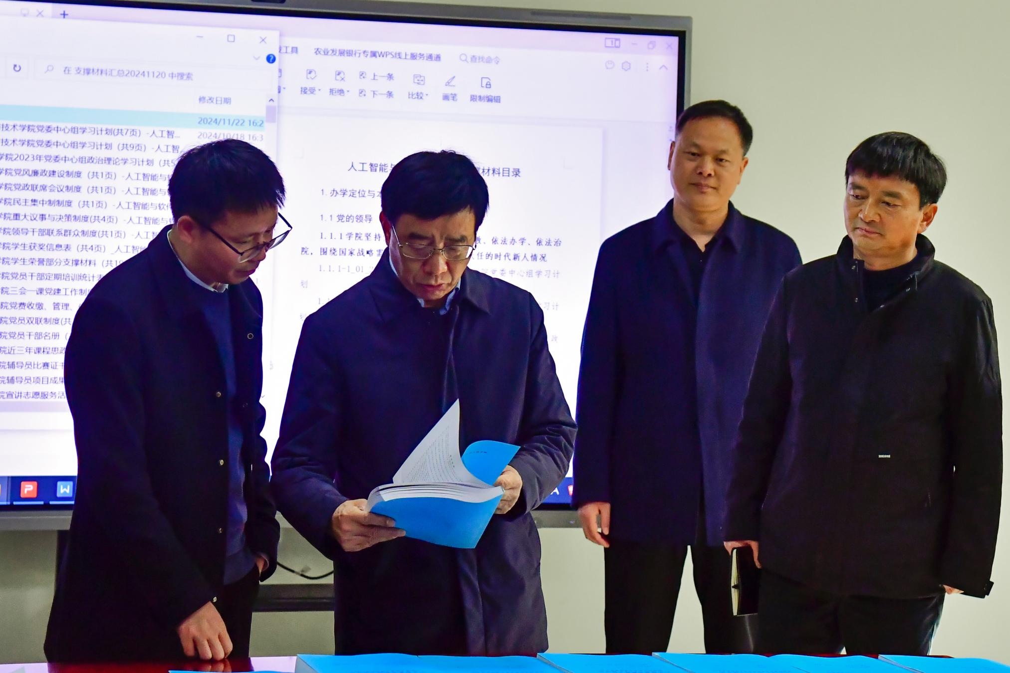 张宝锋先后到马克思主义学院、美术与艺术设计学院、音乐学院、人工智能与软件工程学院进行实地走访,考察了各学院的教学档案室、专业教研室、评建办公室等场所的环境和文化建设情况,详细查看了试卷、教学档案、文件制度汇编等材料的整理和保管情况,认真听取了各学院评估工作开展和准备情况汇报,并针对走访期间发现的材料管理、工作环境、文化建设等问题进行反馈,提出改进意见和建议。