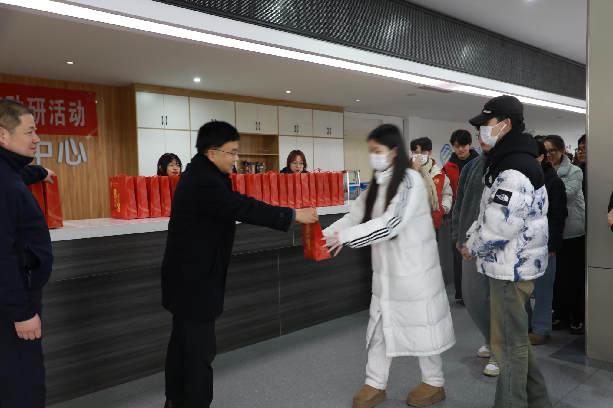 刘红林为同学们发放礼包、加油鼓劲,他勉励大家,一是要在最后冲刺阶段,咬紧牙关,坚持到底;二是要劳逸结合,调节好情绪,以平和的心态去面对即将到来的考试;三是备考期间,学校和老师是大家的坚强后盾,随时准备为他们排忧解难。最后,他祝愿同学们都能金榜题名,所得如所愿。