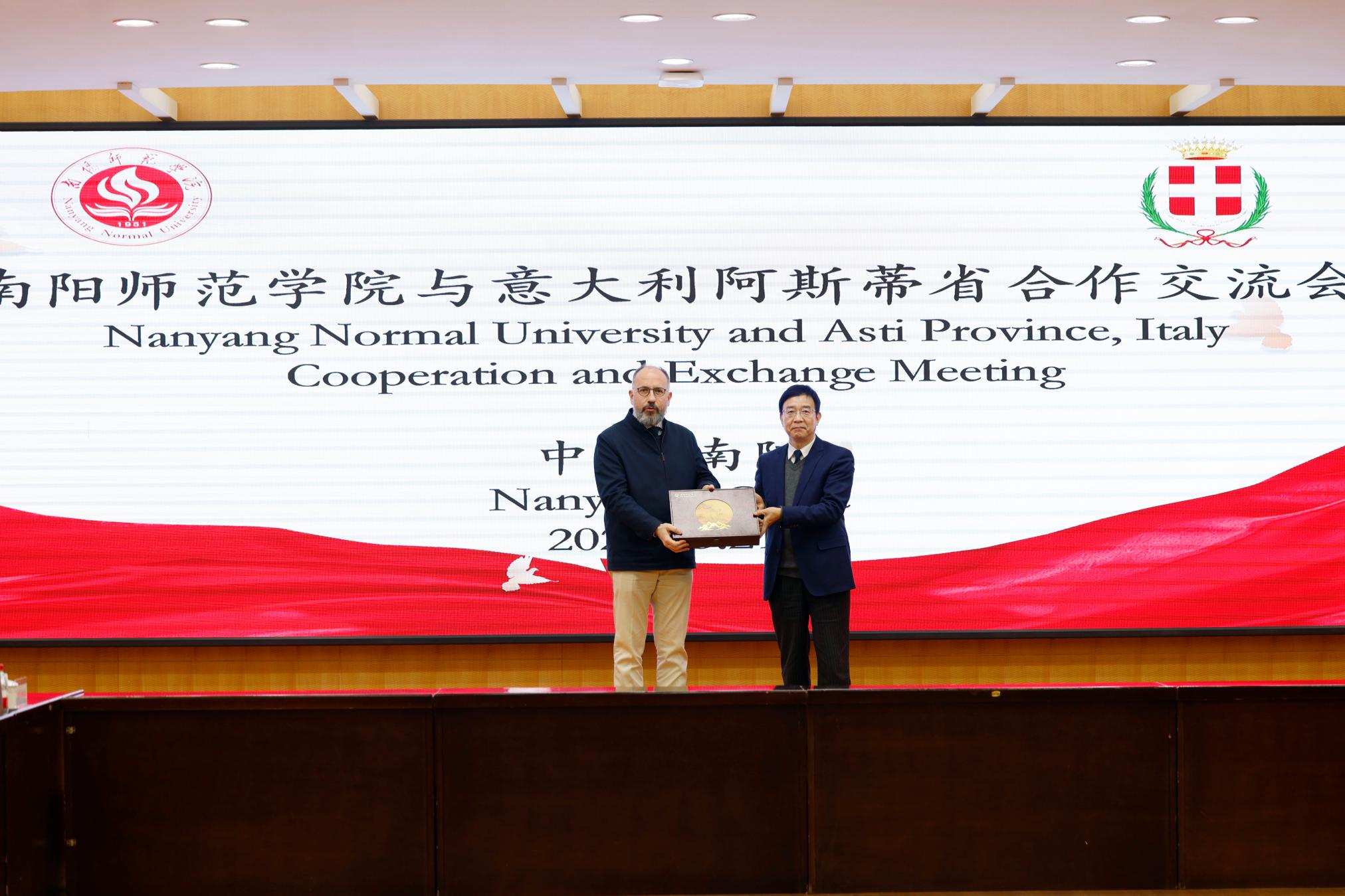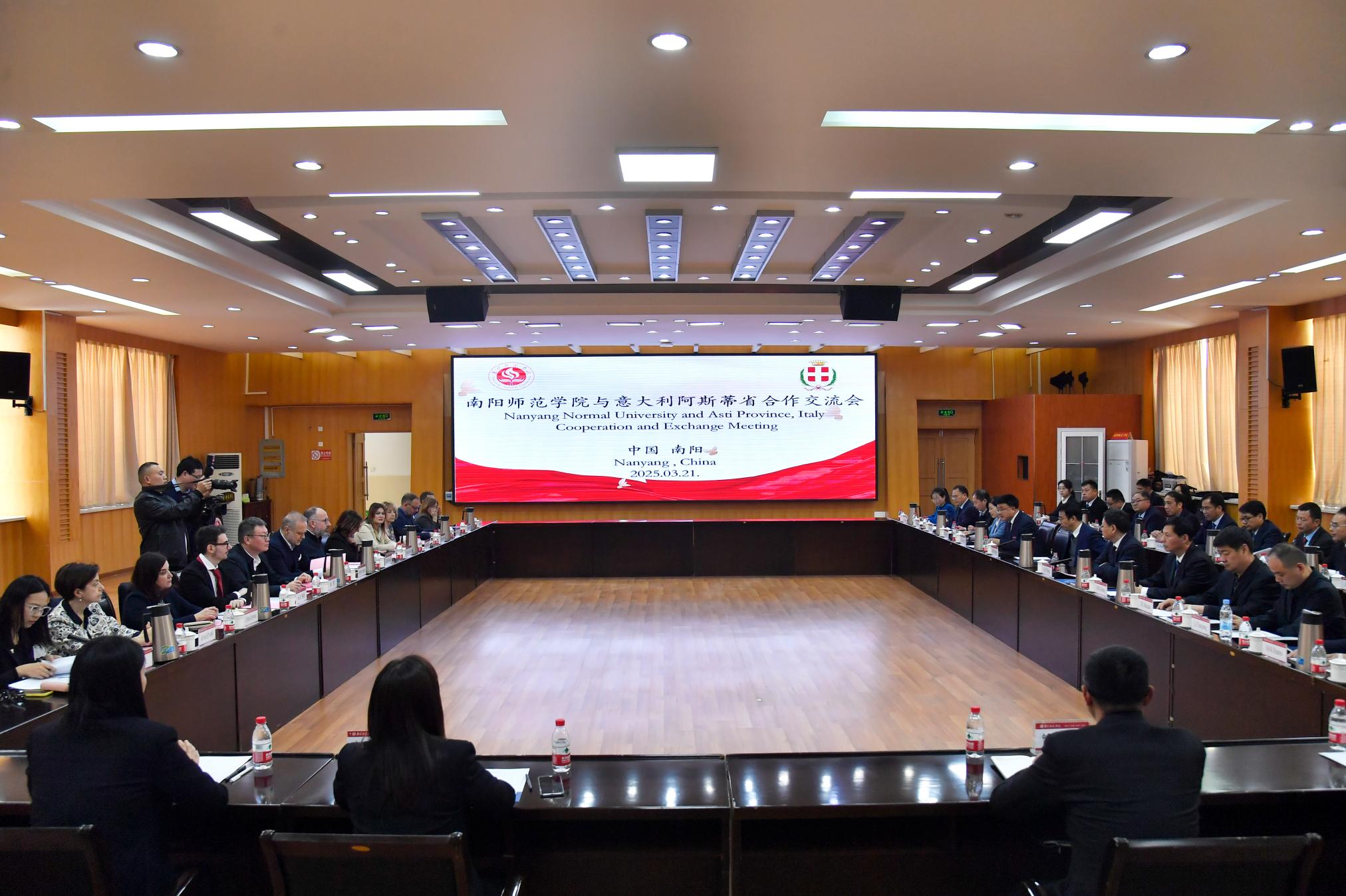本网讯(徐玲珍/文 张莹芳/图)3月21日下午,天游官网在科技大楼三楼会议室举行天游ty8线路1线路2检测中心与意大利皮埃蒙特大区阿斯蒂省代表团合作交流会。阿斯蒂省省长兼阿斯蒂市市长毛里齐奥・拉塞罗一行,南阳市委常委、秘书长李鹏,天游官网党委书记张宝锋,校党委副书记刘红林,副校长熊新忠、王岩、谢海泉出席,相关职能部门和学院负责人以及“意大利威奥斯图中文工坊”教师代表,中意双方代表参加。会议由刘红林主持。