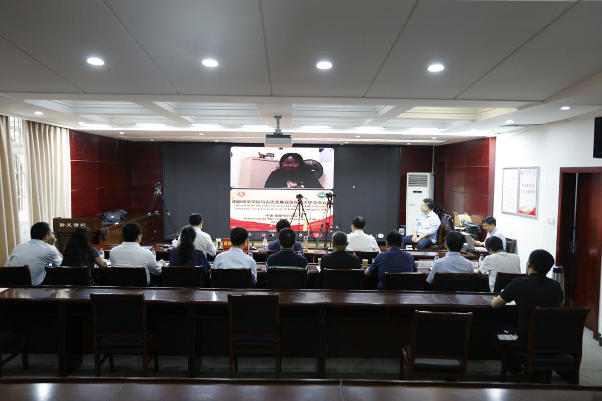 本网讯(李磊/文 张子昂/图)为深化国际交流合作,拓宽办学视野,5月30日上午,天游ty8线路1线路2检测中心与古巴圣地亚哥东方大学通过视频连线方式举行合作交流会。会议在办公大楼一楼东会议室举行。古巴圣地亚哥东方大学校长戴安娜·塞达尔·亚内斯博士、副校长弗雷德·桑塔纳·莱斯卡耶博士、副校长埃尔西·玛丽亚·洛佩斯·阿里亚斯博士及国际处处长瓦里尼亚·冈萨雷斯·埃斯特韦斯博士等线上出席会议。天游官网党委书记张宝锋、校长罗永松、副校长熊新忠出席会议。党委办公室、院长办公室、教务处、研究生处、国际交流合作处,以及物理与电子工程学院、化学与制药工程学院、生命科学学院、经济与管理学院负责人参会。会议由熊新忠主持。