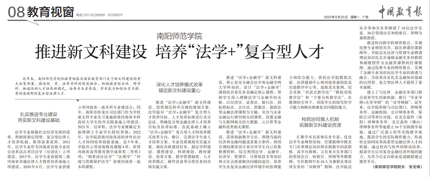 9月25日,《中国教育报》08版刊发天游ty8线路1线路2检测中心校长张宝锋的署名文章《天游ty8线路1线路2检测中心:推进新文科建设 培养“法学+”复合型人才》,现全文转载如下: