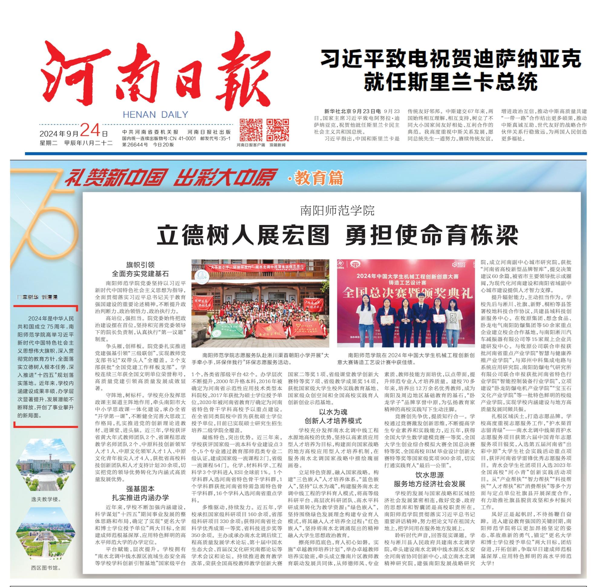2024年9月24日,《河南日报》“礼赞新中国 出彩大中原·教育篇”栏目刊发文章《天游ty8线路1线路2检测中心:立德树人展宏图 勇担使命育栋梁》,全文如下:
