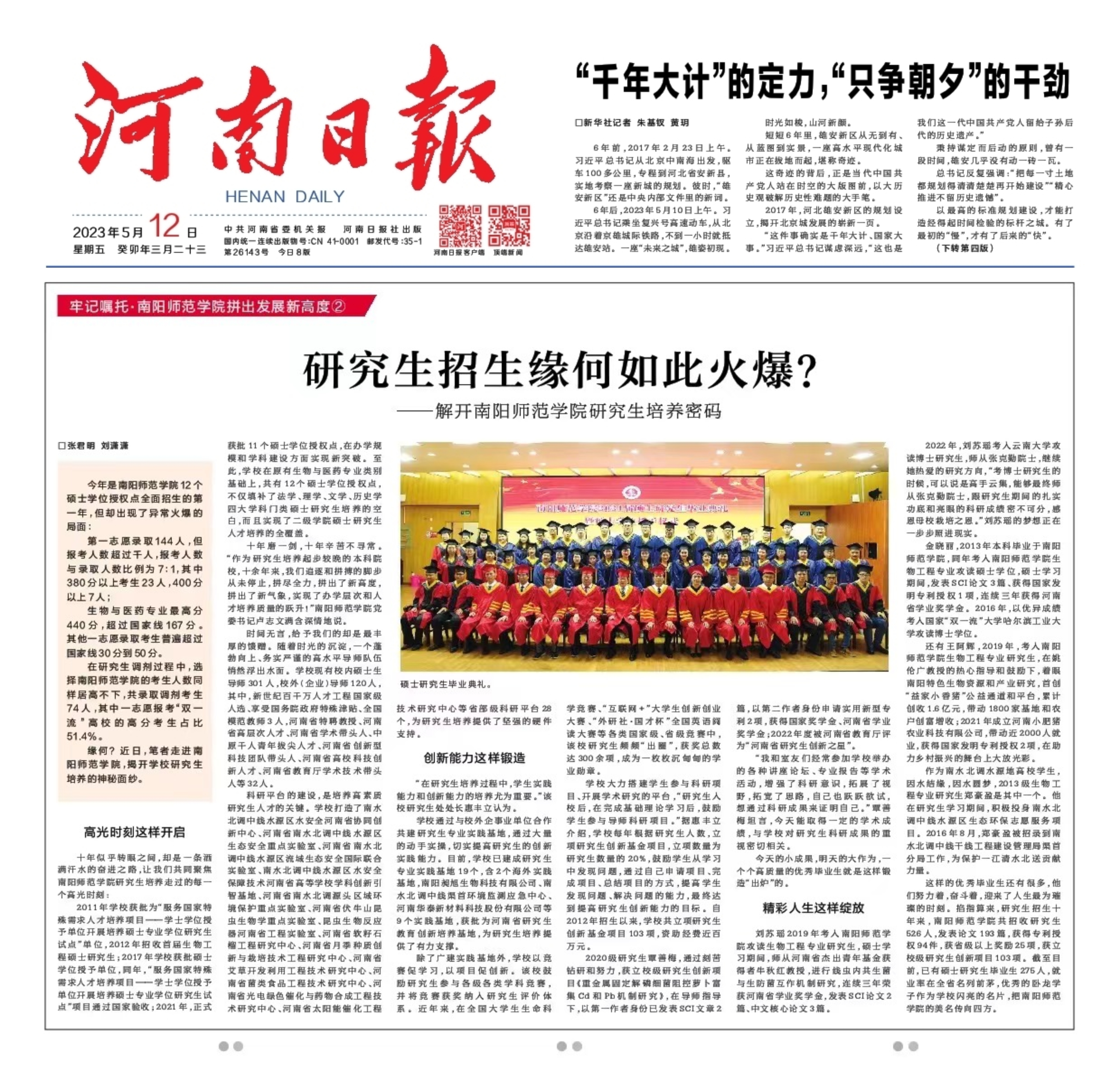 2023年5月12日,《河南日报》“牢记嘱托·天游ty8线路1线路2检测中心拼出发展新高度”栏目刊发天游ty8线路1线路2检测中心系列文章②《研究生招生缘何如此火爆?——解开天游ty8线路1线路2检测中心研究生培养密码》,现全文转载如下: