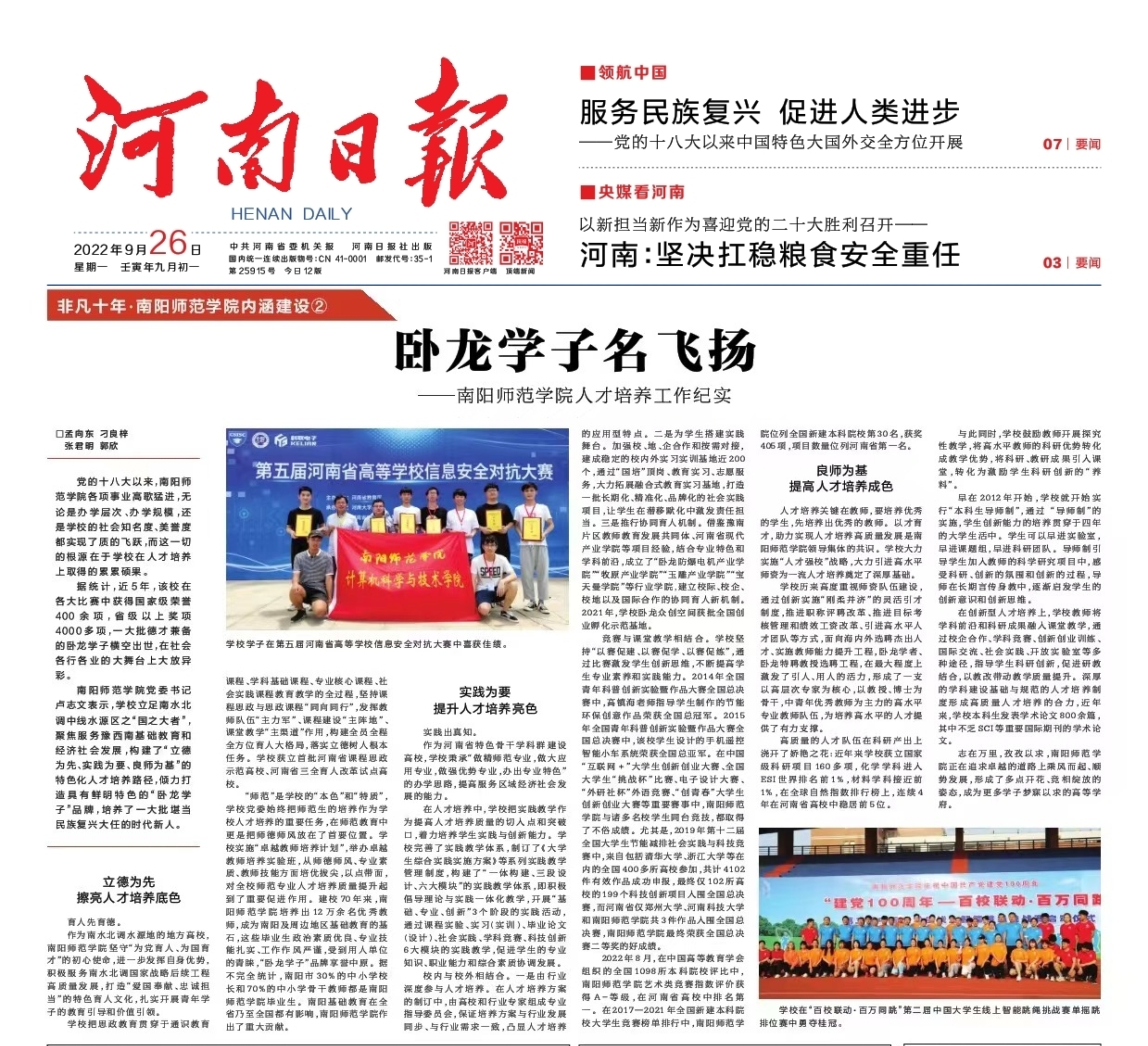 2022年9月26日,《河南日报》“非凡十年·天游ty8线路1线路2检测中心内涵建设”栏目刊发天游ty8线路1线路2检测中心系列文章②《卧龙学子名飞扬——天游ty8线路1线路2检测中心人才培养工作纪实》,现全文转载如下: